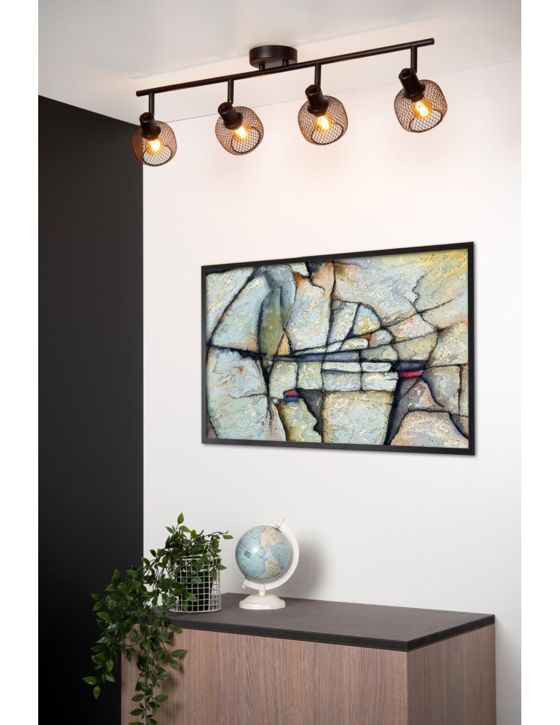 Sa finition noire mate apporte élégance et sobriété,, tandis que ses quatre spots orientables créent un effet visuel dynamique et permettent de jouer avec la lumière.