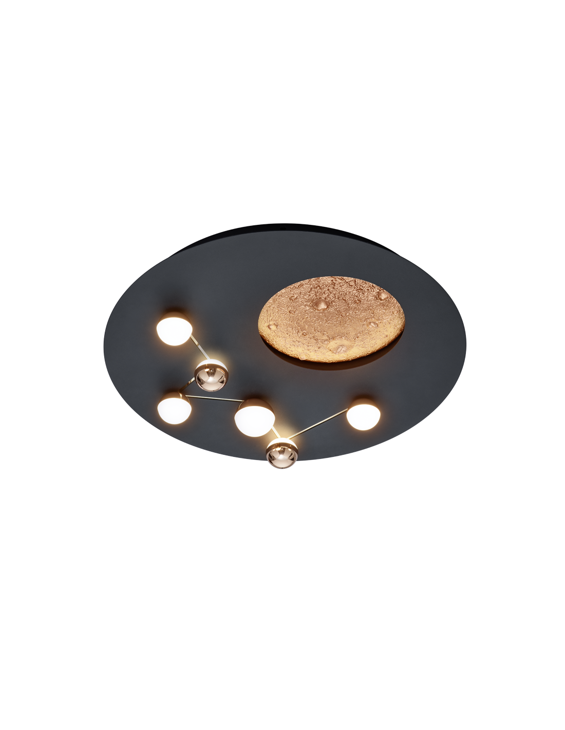 Inspiré par les astres, le plafonnier Zodiac affiche un design céleste en 3D représentant la lune et des constellations, le tout sur un fond noir mat élégant.