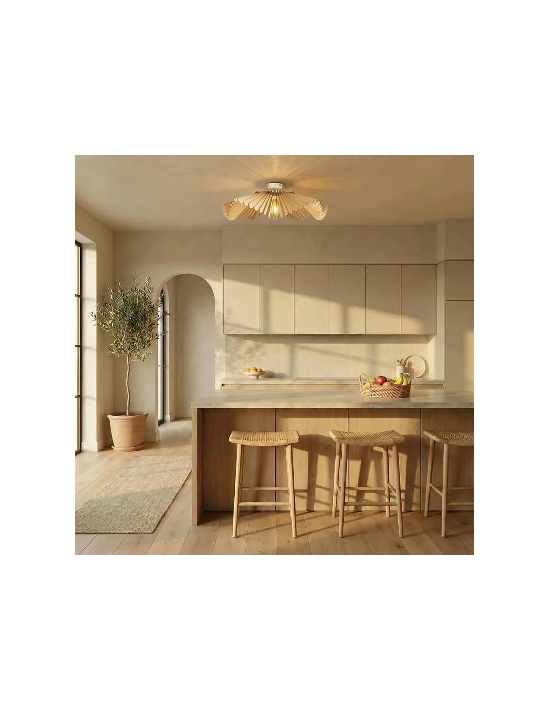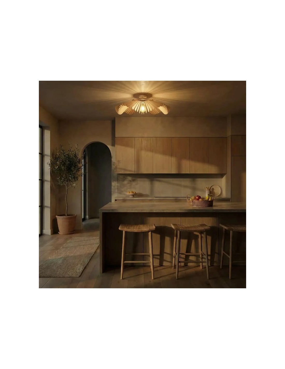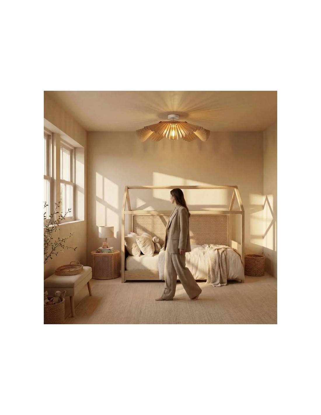Fabriqué en France à partir de peuplier issu de forêts gérées durablement, il se compose de pales inclinées évoquant des pétales en éclosion, diffusant une lumière douce et homogène avec de subtils reflets décoratifs au plafond.