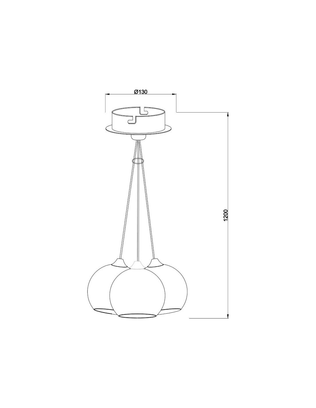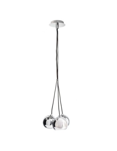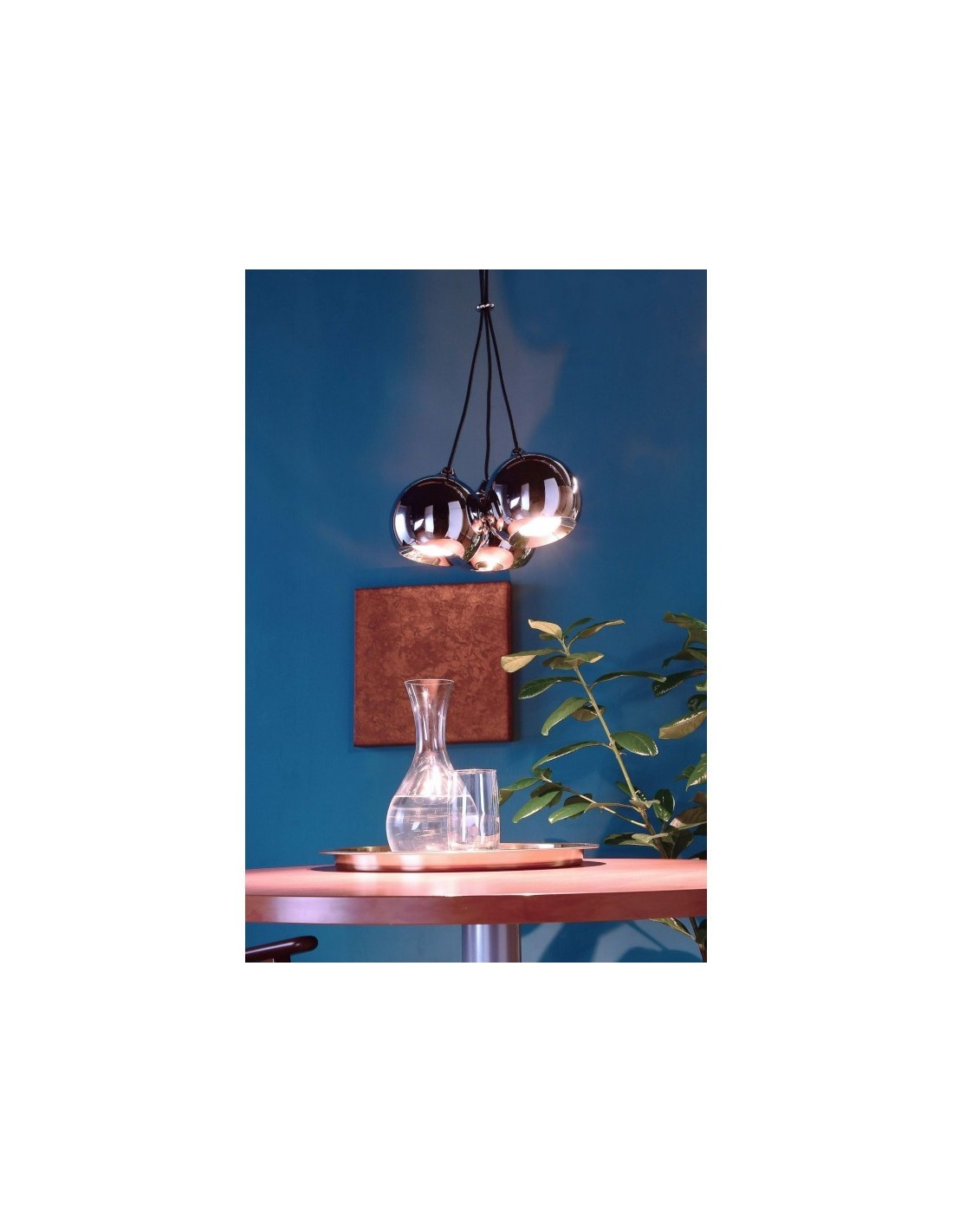 Ce lustre est composé de 3 sphères en verre chromé, de câbles textiles gris et d'une rosace en métal chromé.