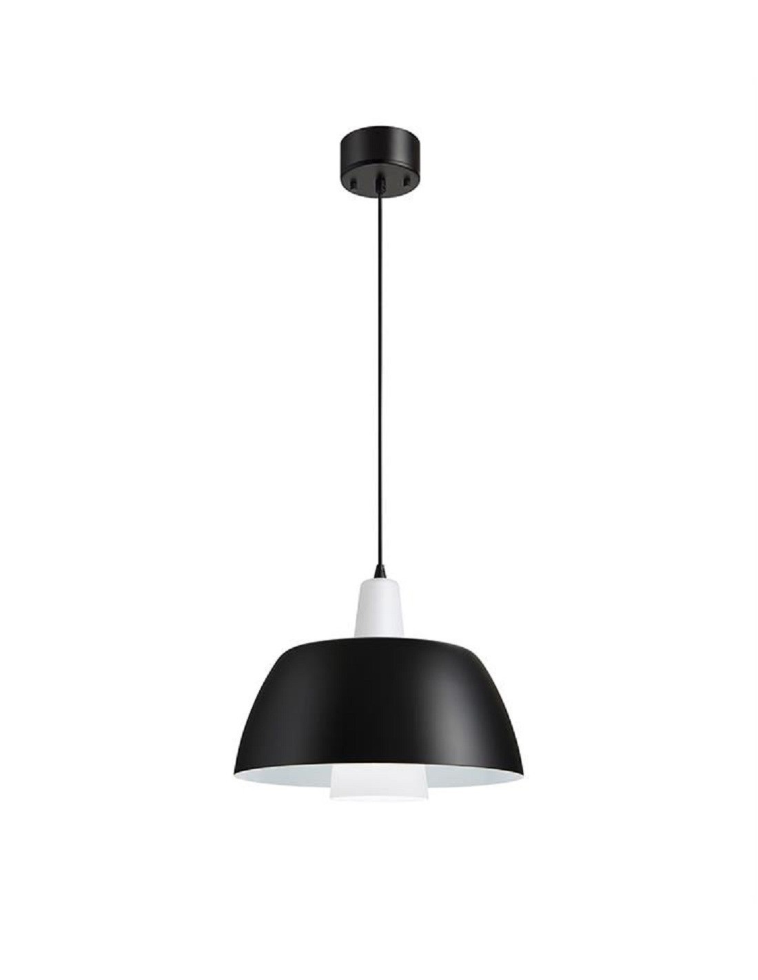 La suspension Solo est composée d'un abat-jour et d'une rosace en métal laqué noir mat ou doré et d'un déflecteur en verre dépoli.