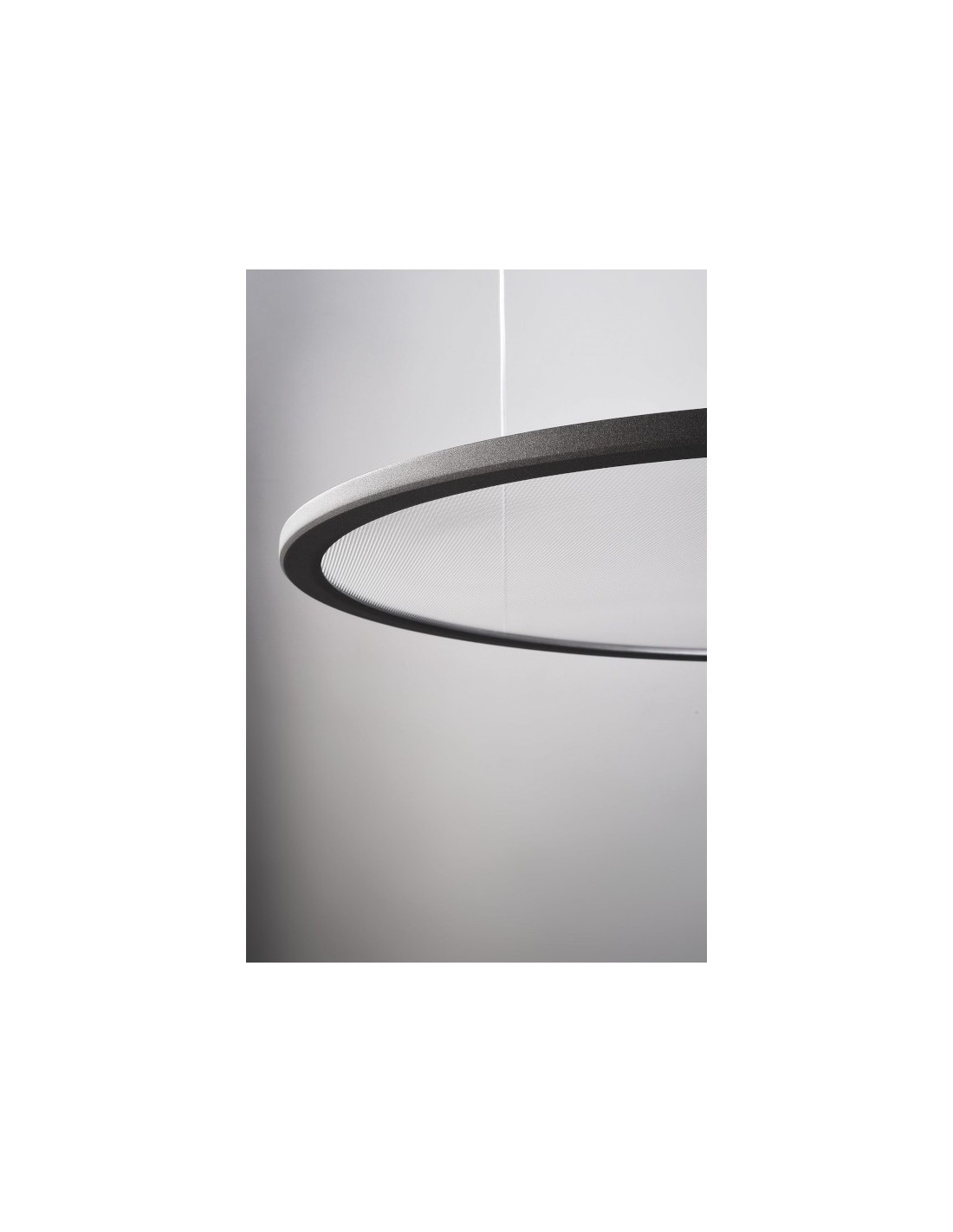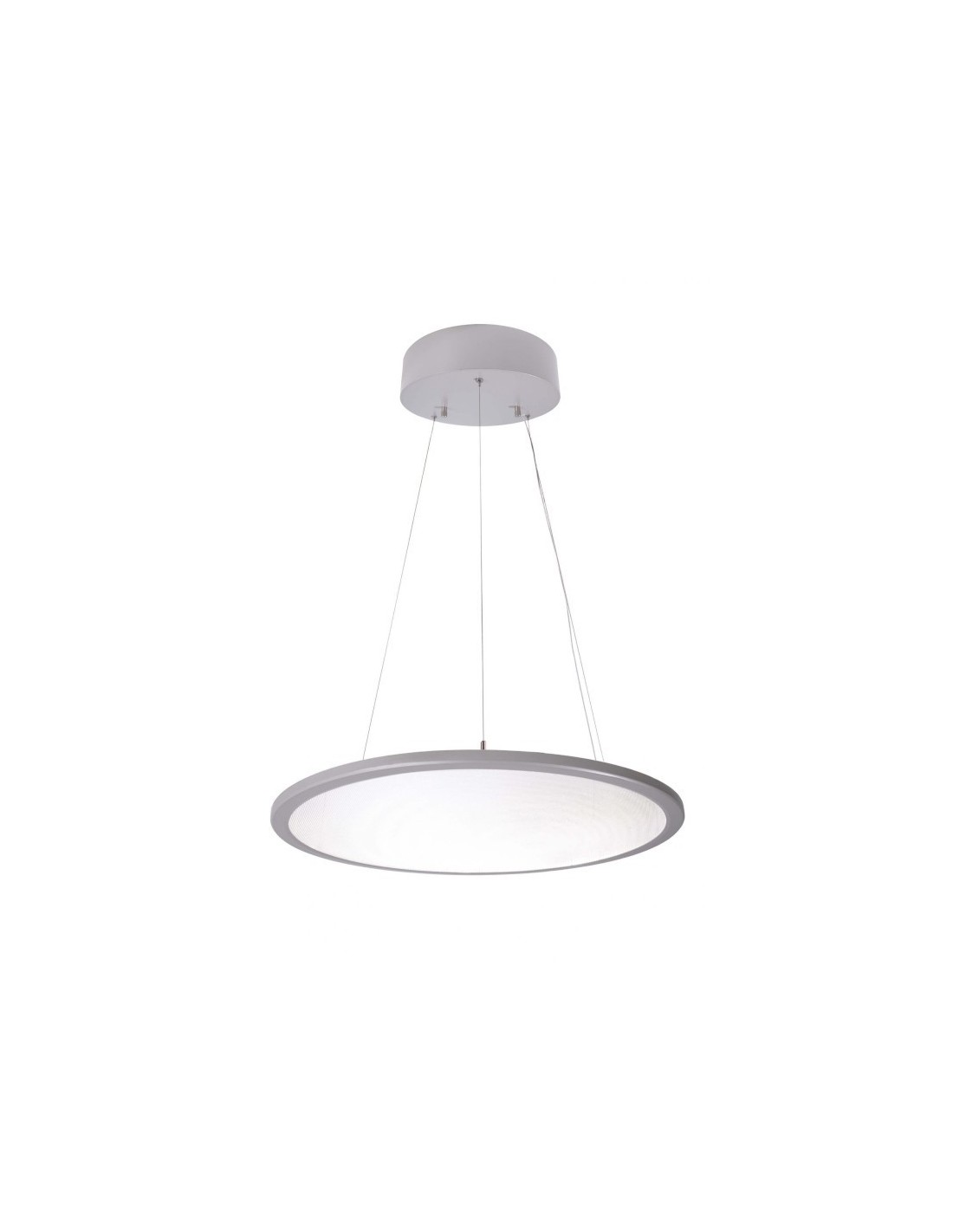 Ce panneau Led transparent est composé d'une rosace de plafond en aluminium, d'un cadre en aluminium également, de filins de suspension en acier et d'un diffuseur en PMMA.