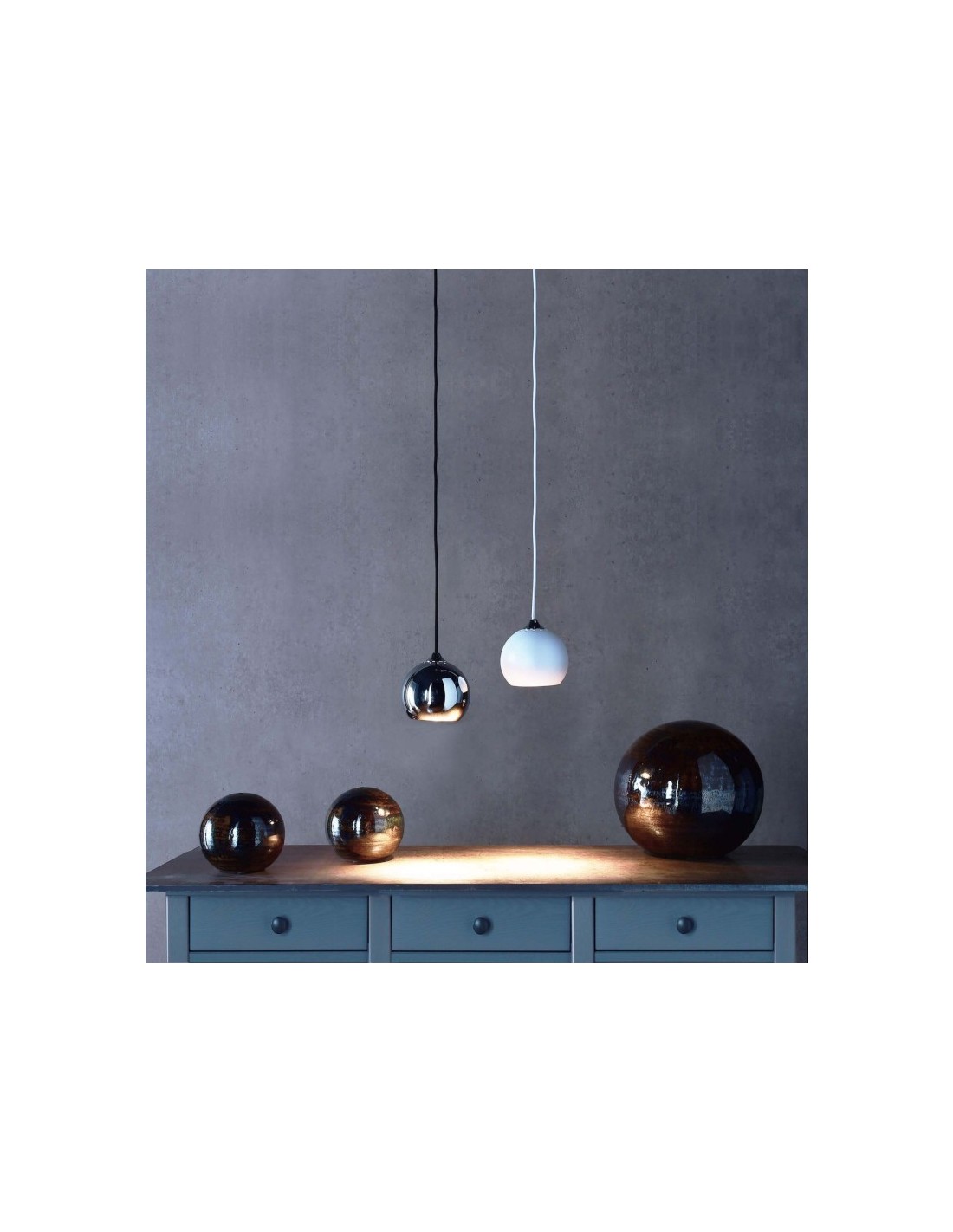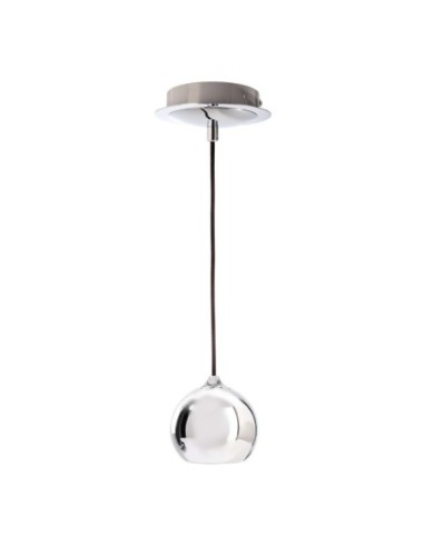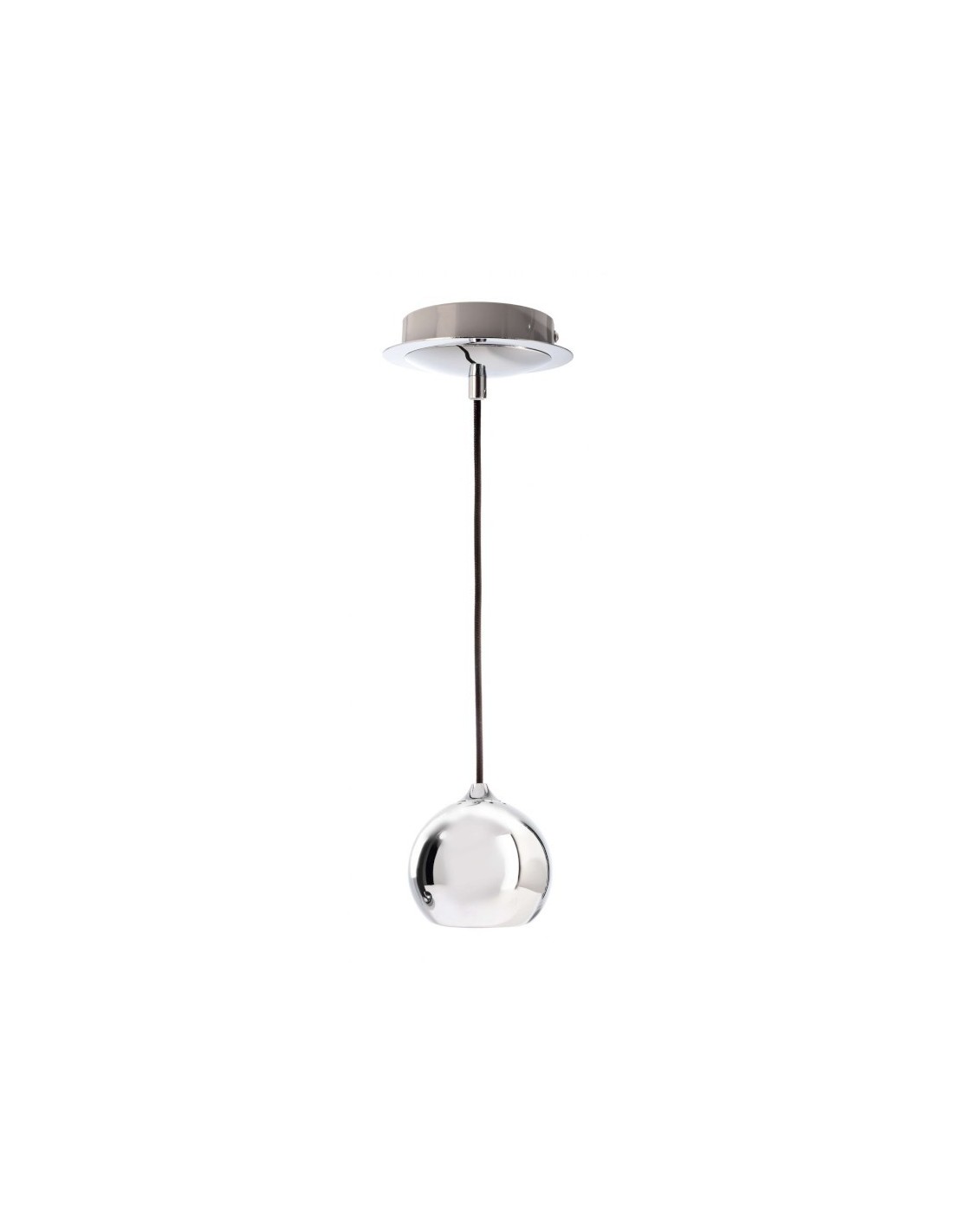 Ce lustre est composé d'une sphère et d'une rosace en métal chromé et d'un câble textile noir.