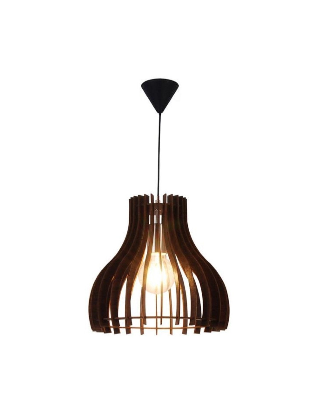 Cette suspension est composée d'une rosace de plafond en plastique noir, d'un câble de suspension réglable en PVC noir d'une longueur de 1,36 m et d'un abat-jour en lamelles de bois peintes en noir..