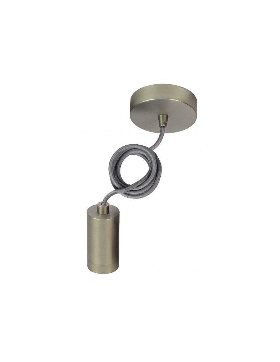 Cette suspension est composée d'une rosace de plafond en acier satiné, d'un câble de suspension réglable en textile gris d'une longueur de 2 mètres et d'une douille culot E27 en acier satiné.