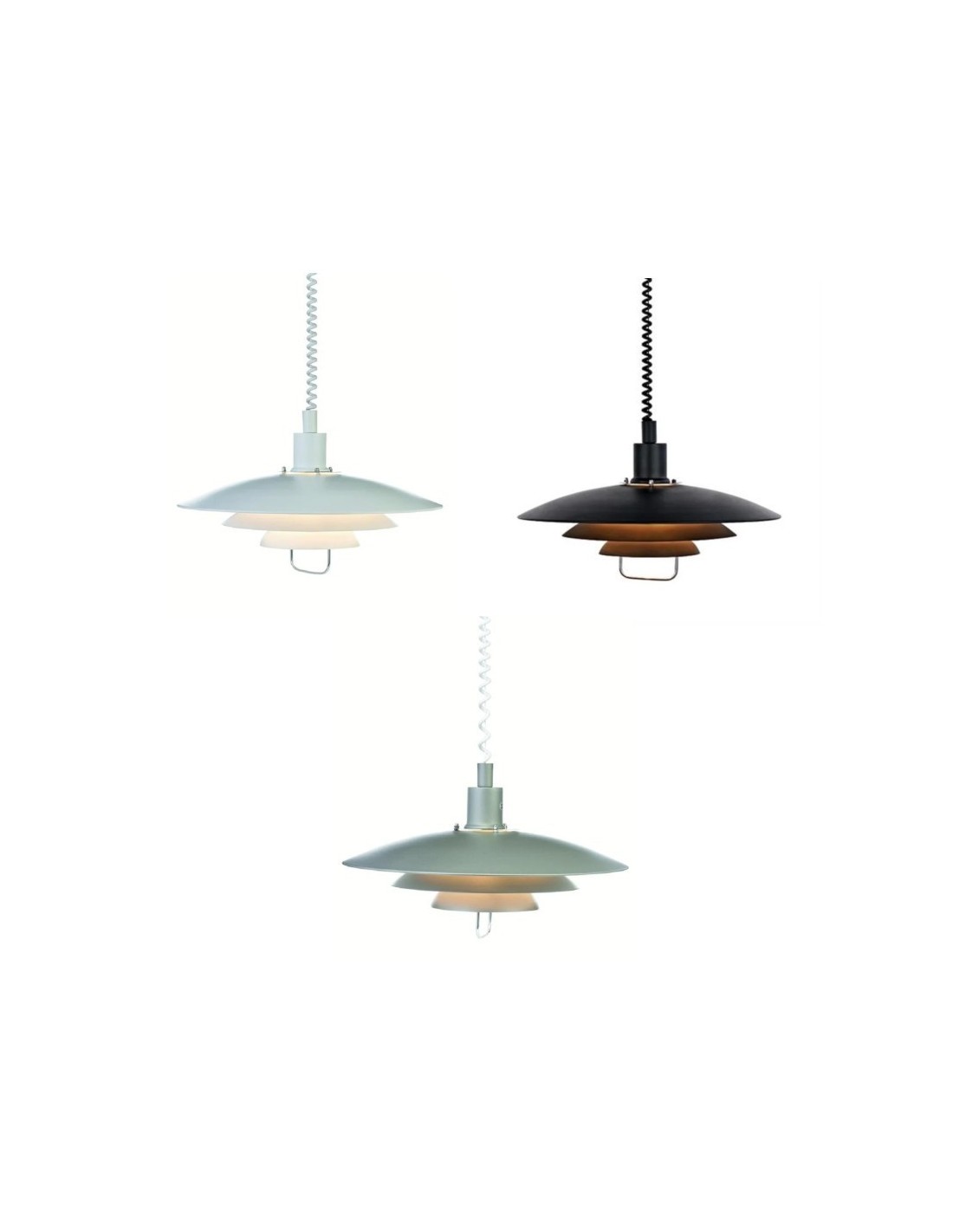 Cette suspension led lumineuse en métal laqué blanc , gris ou noir, intérieur blanc est équipée d'un câble à ressort  dit ''monte et baisse'' permettant de changer la hauteur à volonté (de 80 cm minimum à 1,90 m maximum).