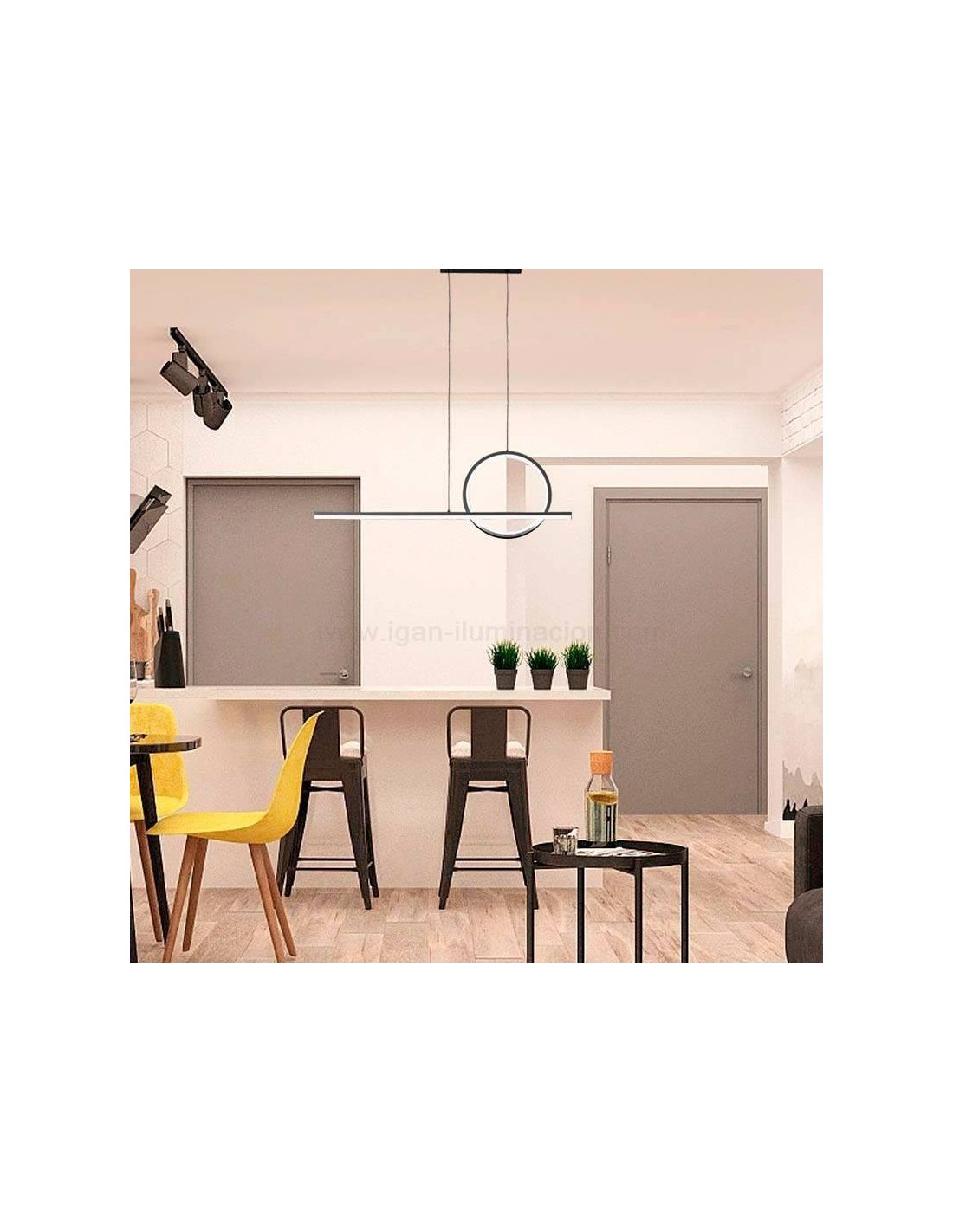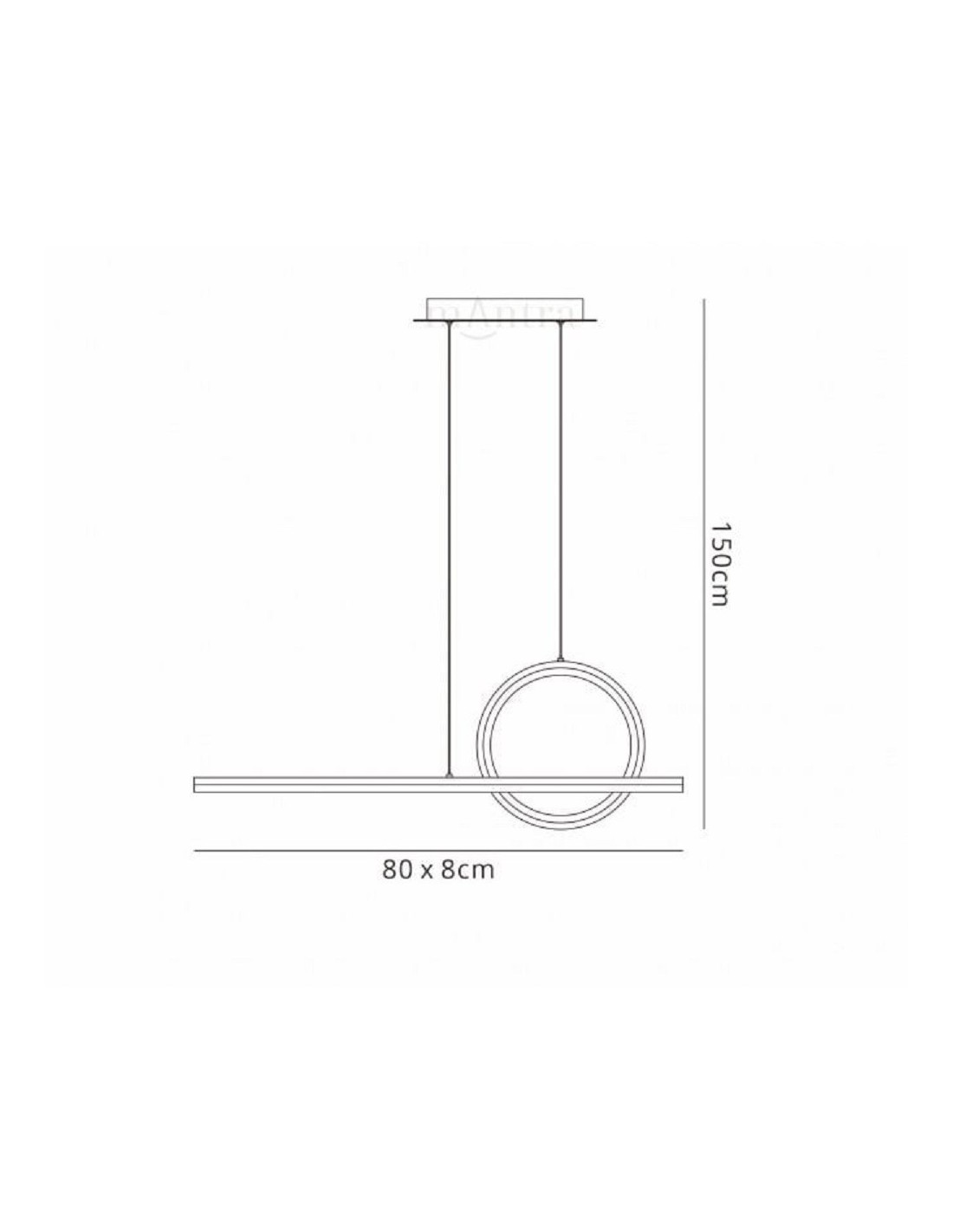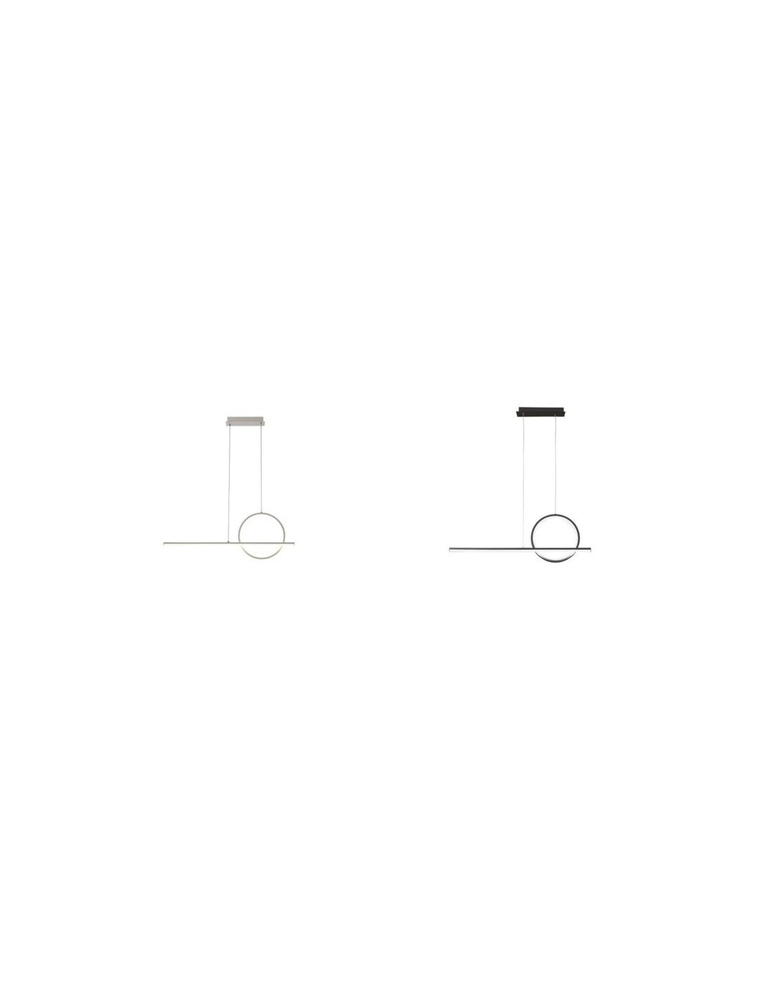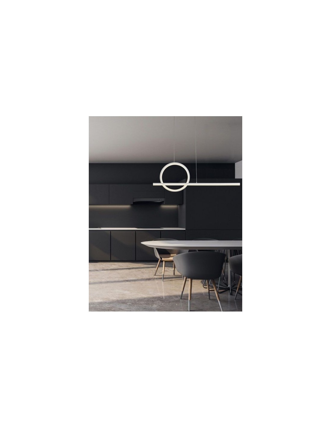 En effet, elle est composée de deux éléments lumineux, un tube et un cercle suspendus par deux câbles réglables en hauteur. Le luminaire semble flotter dans les airs.