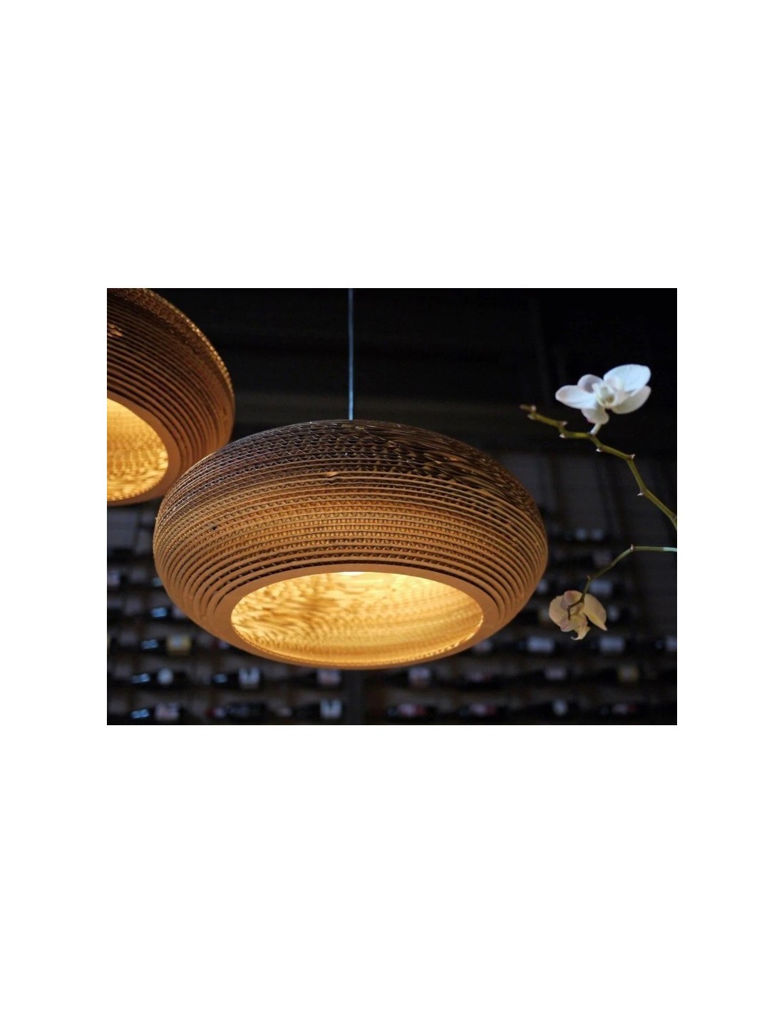 La lumière priojetée au travers des ondulations du carton produit un éclairage chaleureux et intime.