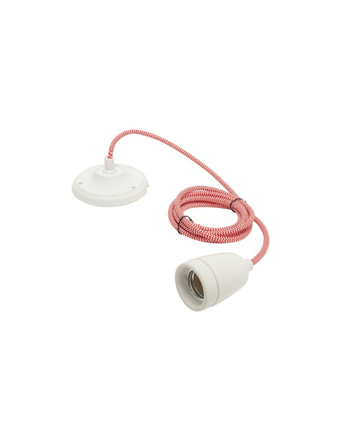 Matière : Porcelaine - câble textile - Couleur : rosace et douille blanches - câble rouge et blanc