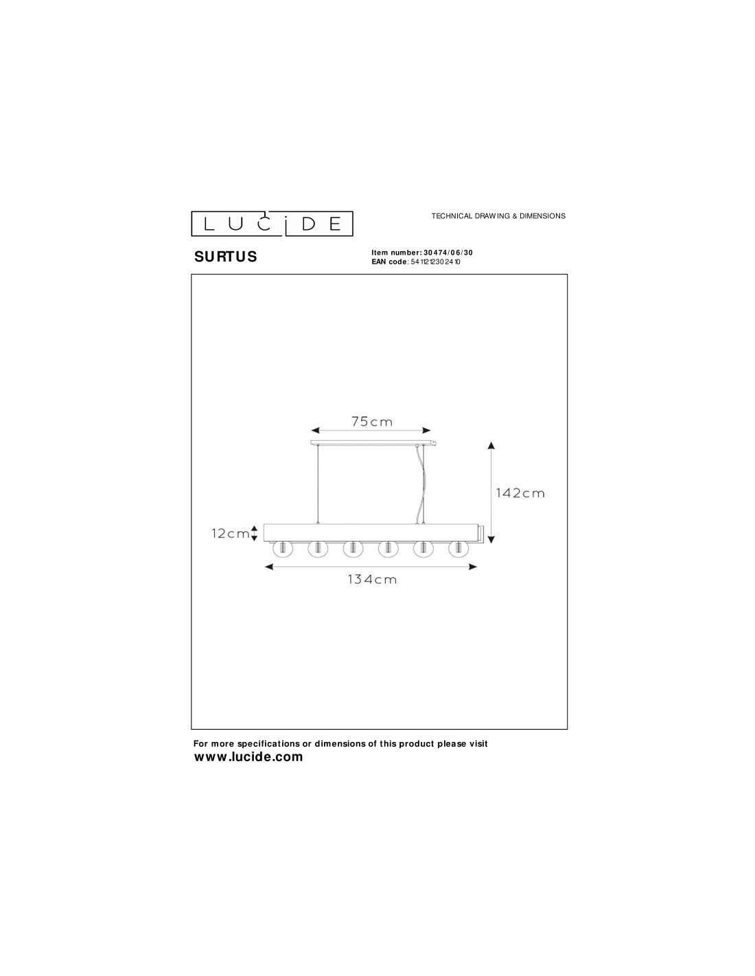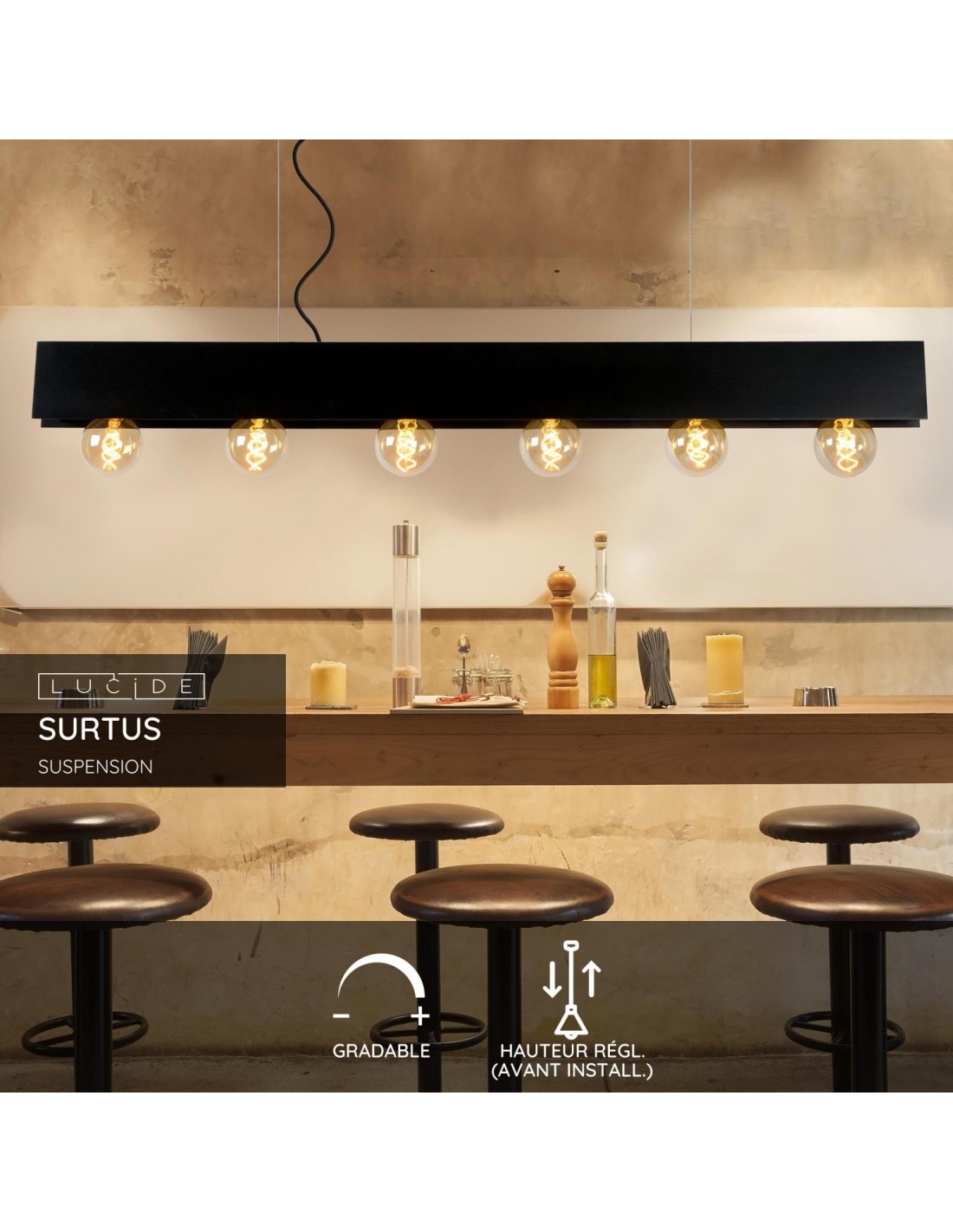 La Surtus est une suspension aux finitions épurées dotée de pas moins de six points lumineux. Les raccords des lampes sont dissimulés dans une fine tôle d'acier. Les deux bandes d'acier sont alignées parallèlement sur une longueur de 130 centimètres. Là où se rencontrent les raccords coudés, les deux longues plaques continuent de s'étendre. Le résultat fait apparaître une illusion d'optique dans laquelle semble flotter l'ensemble. La Surtus est réglable en hauteur et peut être connectée à un variateur.