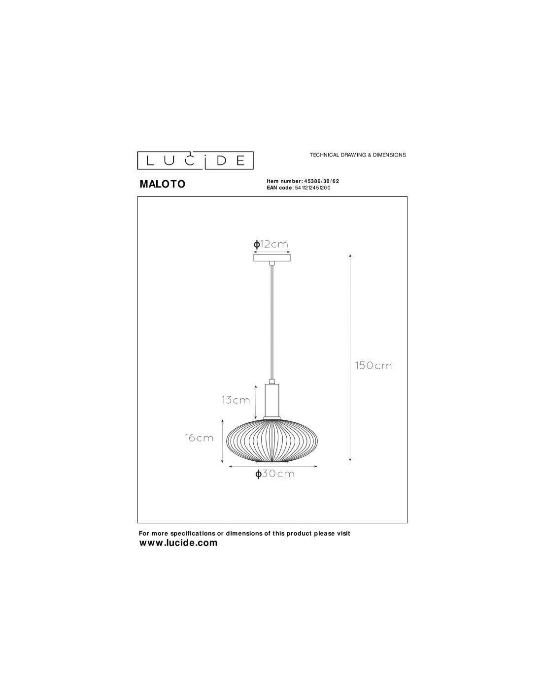 Avec un diamètre de 30 cm et une structure en verre avec plaque de fixation en métal, ce luminaire possède un indice de protection IP20 et une classe électrique I, adaptés à une utilisation en intérieur.