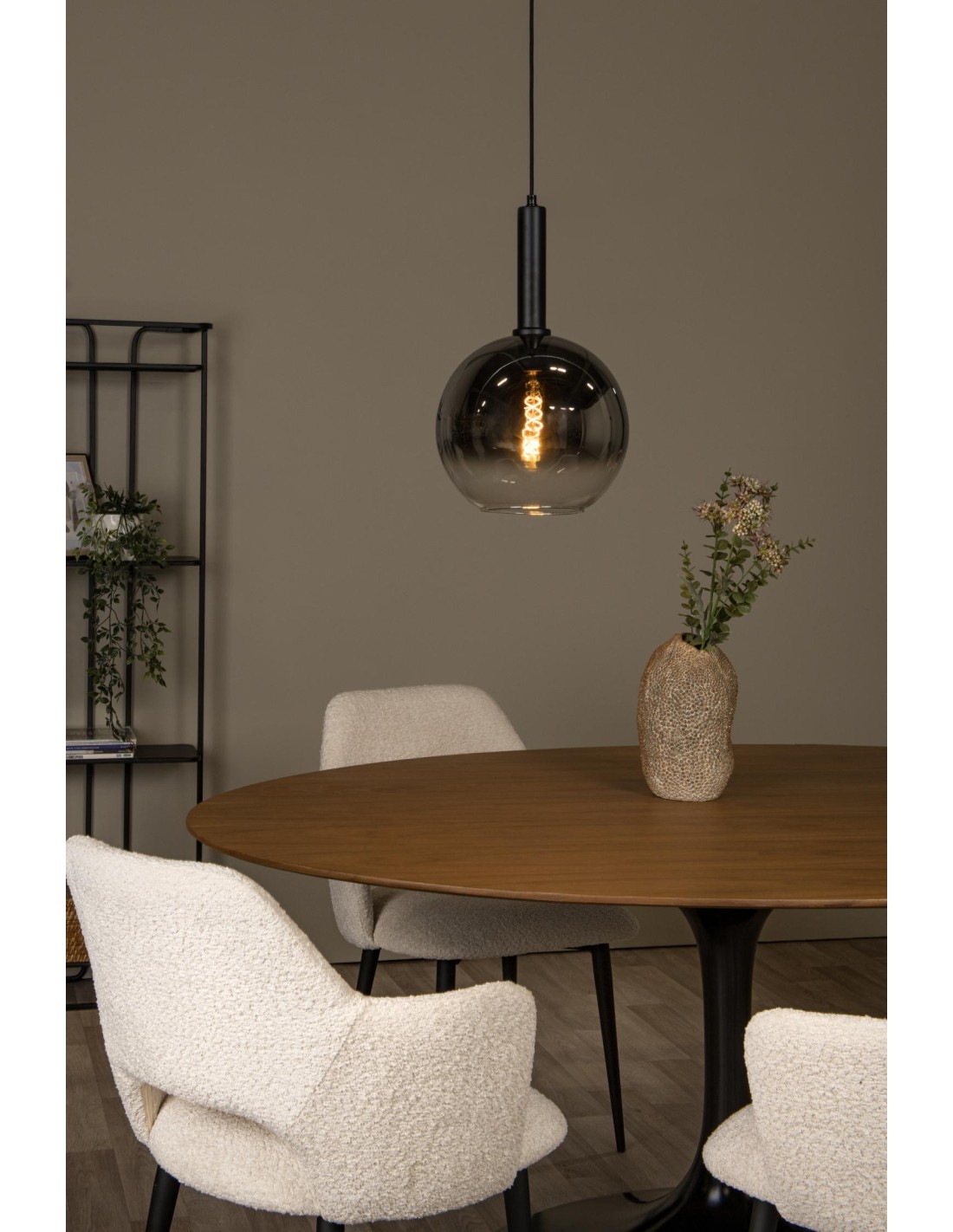La suspension MARIUS séduit par son design minimaliste et intemporel, associant une structure noire élégante à un globe en verre fumé qui crée un effet visuel raffiné et sophistiqué.