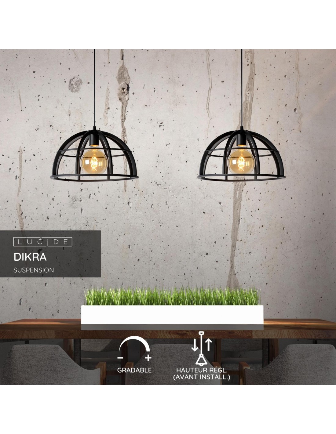 La suspension DIKRA de Lucide séduit par son design moderne et industriel, alliant lignes épurées et finition noire mate pour un style contemporain et élégant.