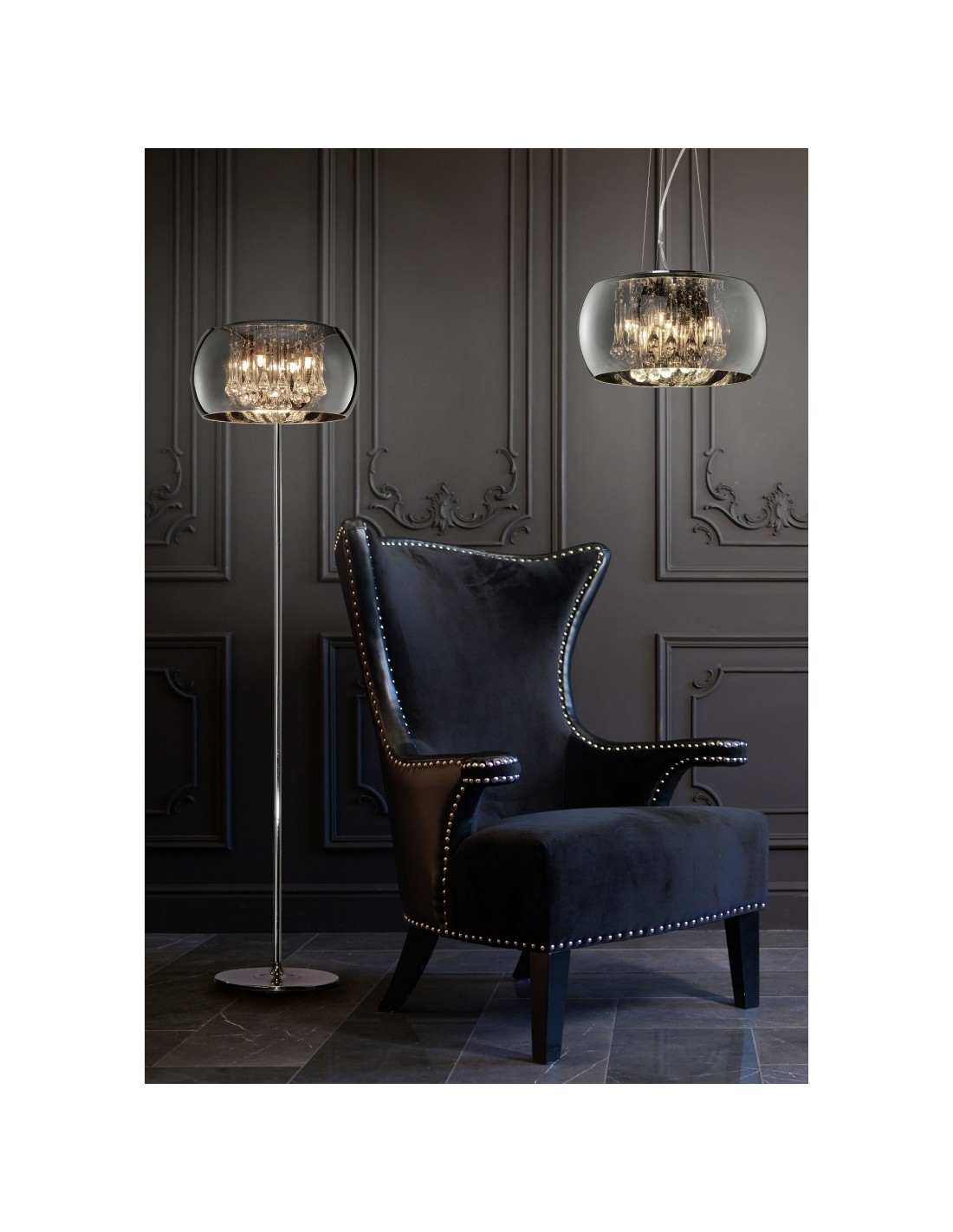 La suspension Vapore signée Trio se distingue par son abat-jour en verre chromé qui reflète élégamment la lumière ambiante lorsqu’il est éteint, et révèle de magnifiques gouttes de verre intégrées lorsqu’il est allumé.
