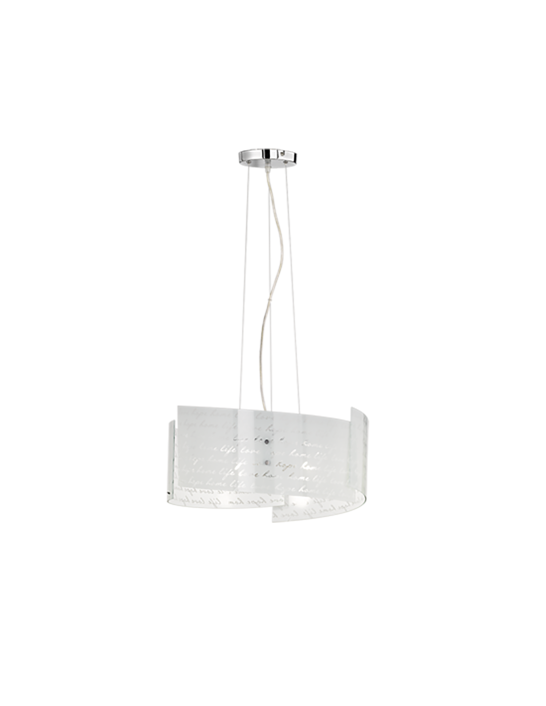 La suspension TRIO Signa est équipée de trois douilles E27 pouvant accueillir des ampoules jusqu’à 40 watts chacune. Le diffuseur en verre satiné est orné de l’inscription décorative "Hope. Home. Life. Love.", projetant une lumière douce sur les côtés tout en diffusant un faisceau lumineux vers le bas.