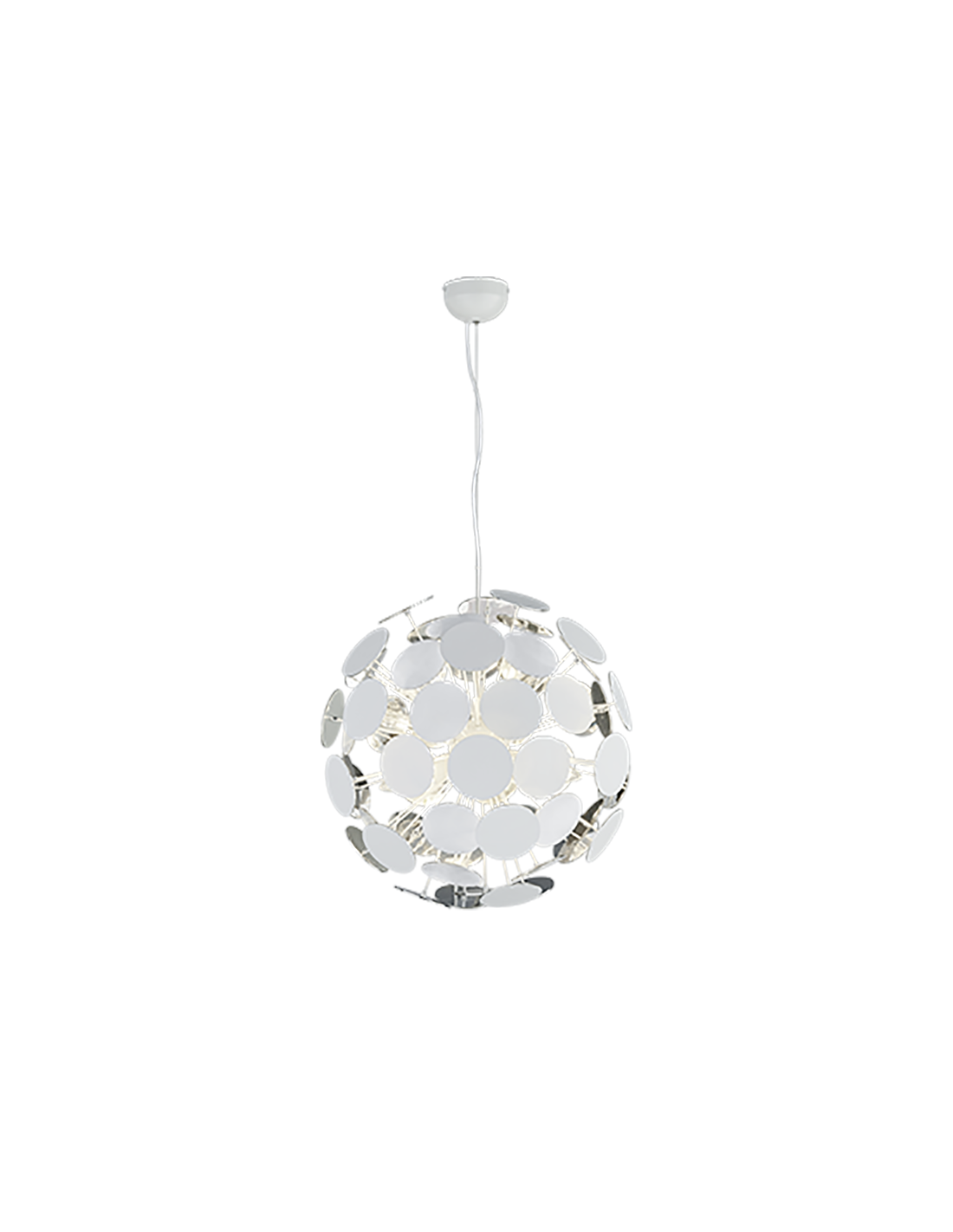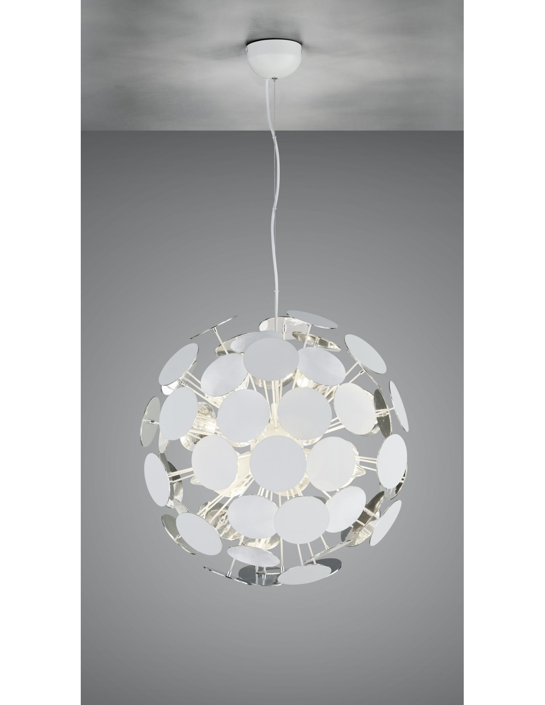 La suspension Discalgo de TRIOséduit par son design moderne et original, inspiré d’un pissenlit lumineux. Avec ses six disques en plastique blanc mat à l’extérieur et argentés à l’intérieur, elle crée un jeu subtil entre lumière et ombre, parfait pour le salon ou la chambre.