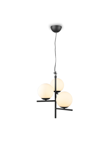 Le corps métallique noir mat et les diffuseurs en verre blanc créent un contraste élégant tout en diffusant une lumière douce et agréable. Ce luminaire est particulièrement adapté pour éclairer la table à manger ou pour ajouter une touche d’élégance à votre salon ou cuisine.