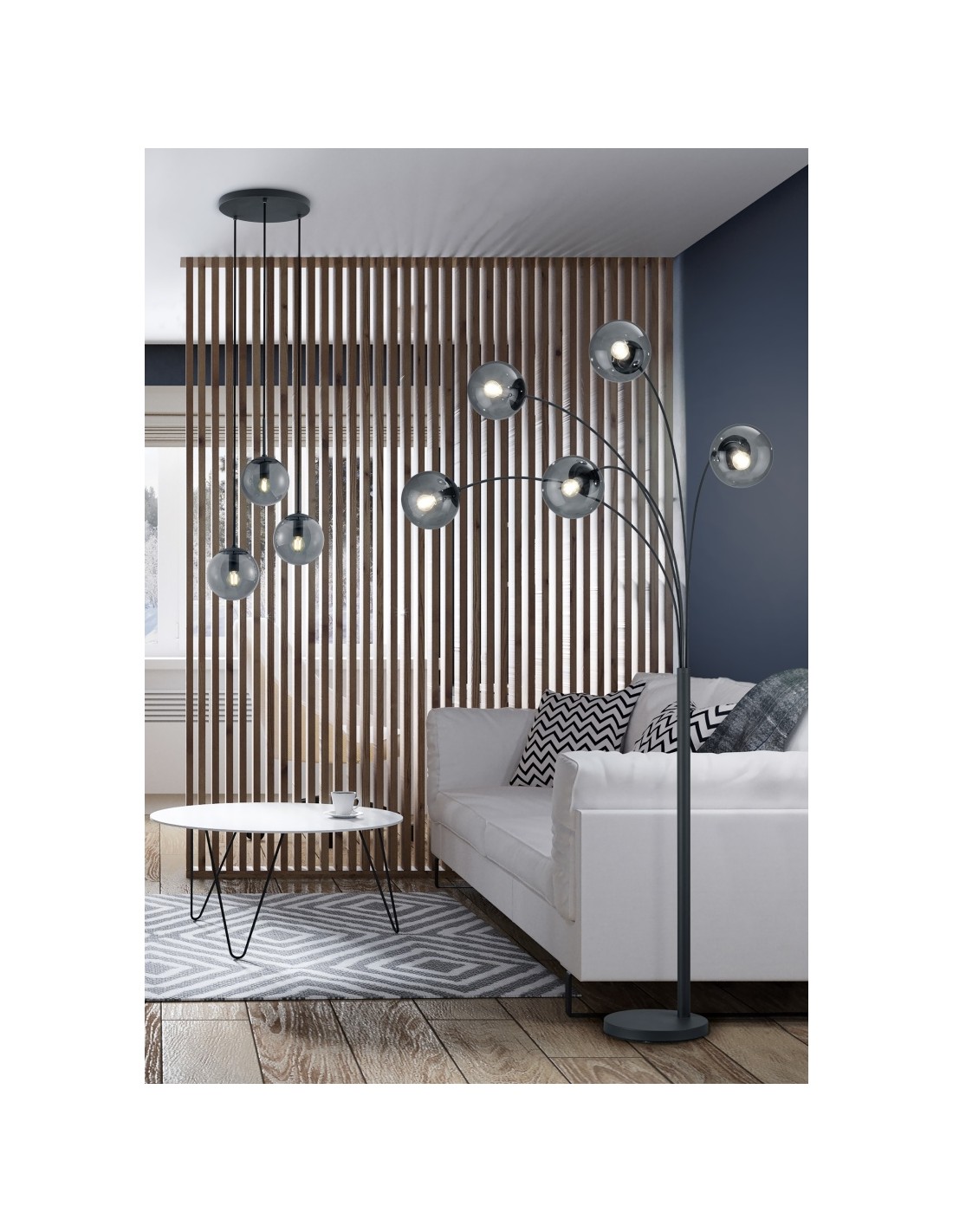 La suspension Balini signée Trio se distingue par son design sobre et raffiné. Elle est composée de trois abat-jour en verre fumé suspendus à différentes hauteurs (réglables individuellement), apportant ainsi un jeu visuel élégant et harmonieux à votre pièce.