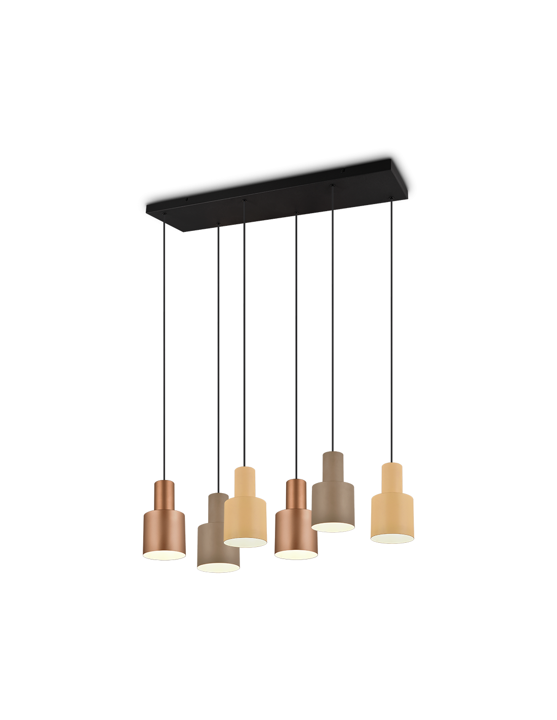 La Suspension AGUDO de Trio se distingue par son design moderne et minimaliste. Elle est équipée de six abat-jours en métal de couleurs naturelles (taupe, beige et café), offrant une combinaison de hauteurs différentes pour un effet visuel unique. Cette suspension est parfaite pour apporter une touche d'élégance au-dessus de votre table de salle à manger ou dans votre salon.