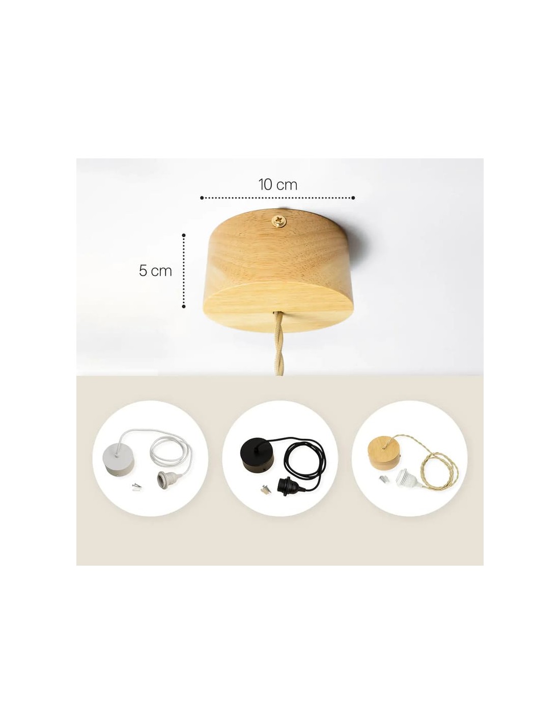 Matière : structure en bois de peuplier - câble textile - Couleur : naturel - blanc - Rosace: métal ou bois