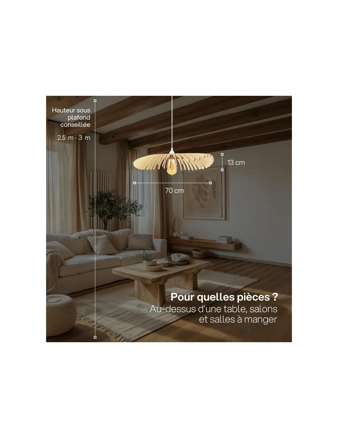 Avec un diamètre de 70 cm, une hauteur de 13 cm et un poids d'environ 1,08 kg, cette suspension se distingue par son format équilibré, idéale pour structurer un espace sans l'alourdir.