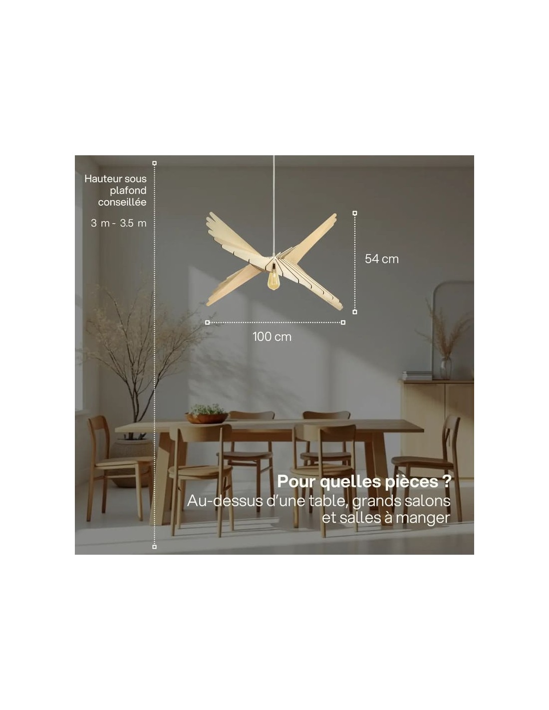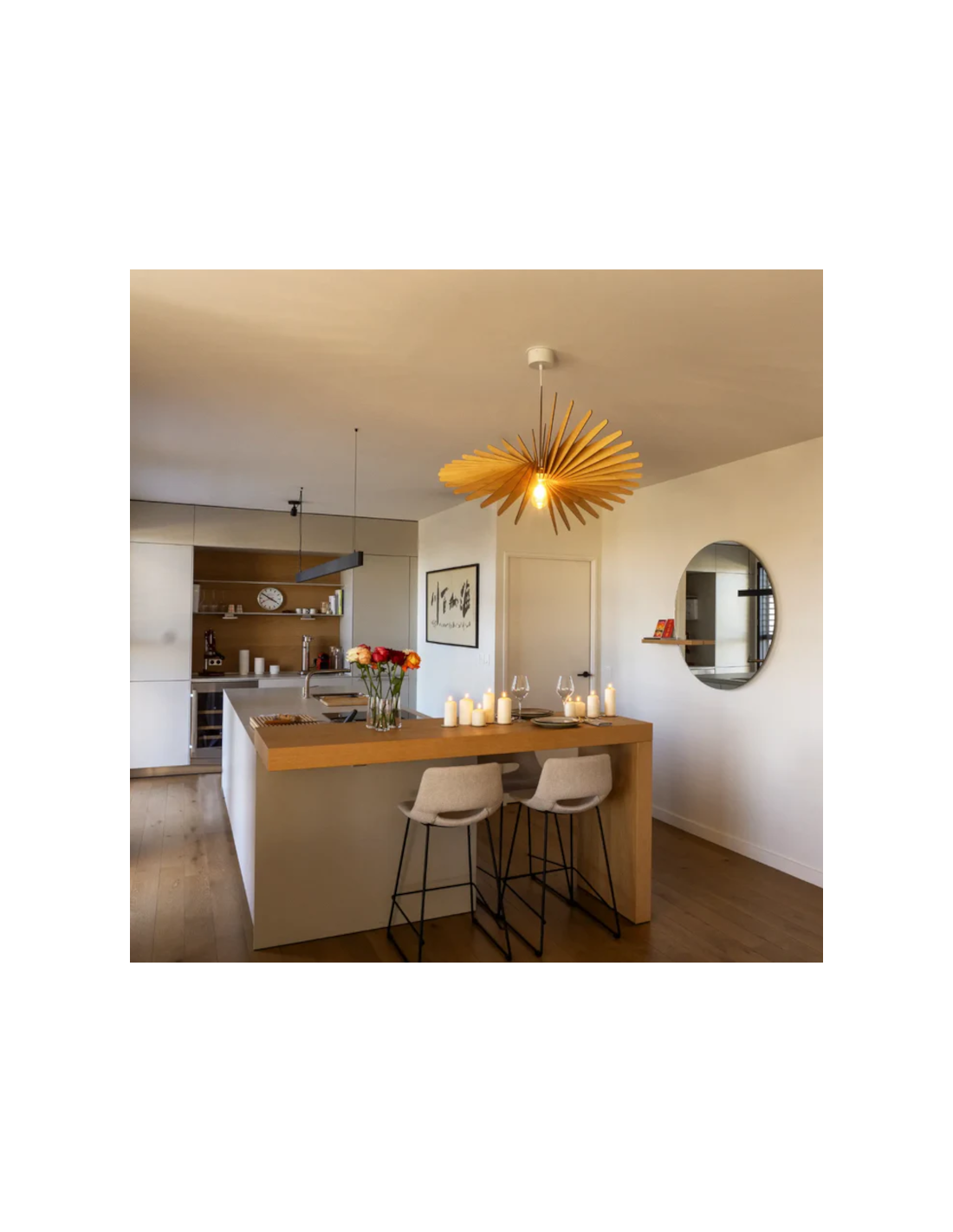 La suspension Albatros ø 100 cm en finition chêne de l'Atelier Loupiote se distingue par son format spectaculaire et sa silhouette graphique, idéale pour habiller les grands volumes.