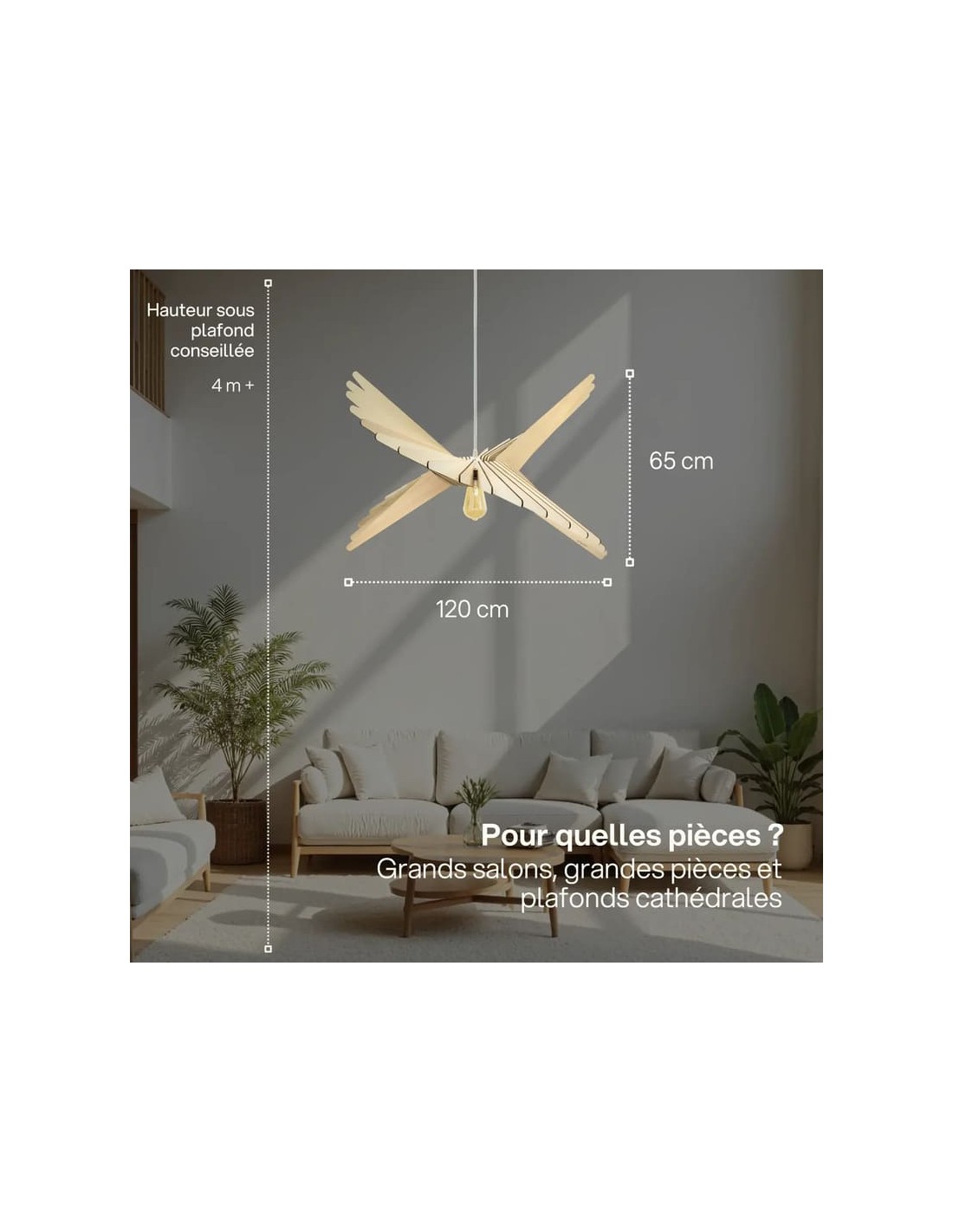 La suspension Albatros ø 120 cm en finition chêne de l'Atelier Loupiote est un luminaire décoratif XXL alliant design aérien et fabrication artisanale française.