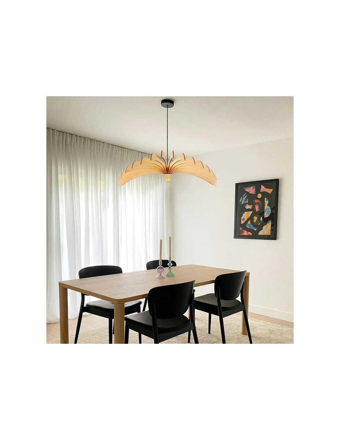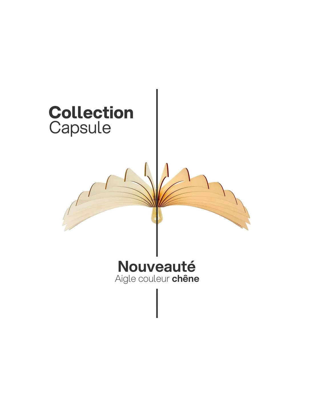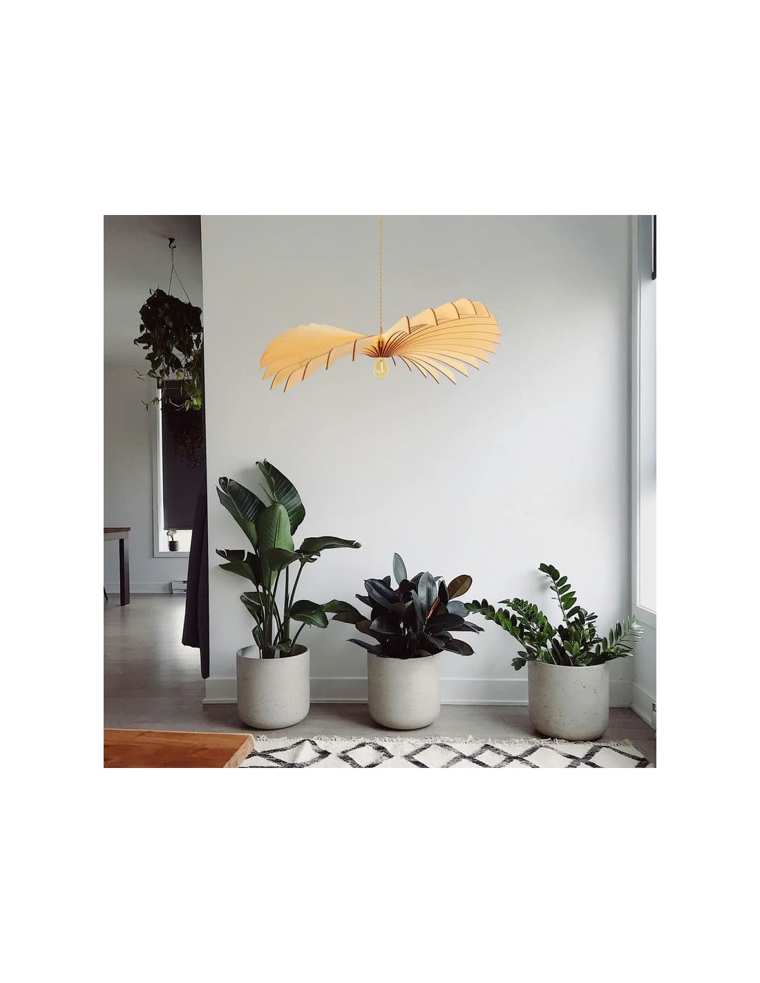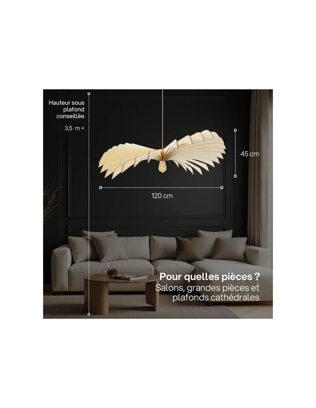 Avec son format spectaculaire de 120 cm de diamètre, la suspension Aigle teinté chêne de l'Atelier Loupiote s'impose comme une pièce centrale dans l'aménagement intérieur.