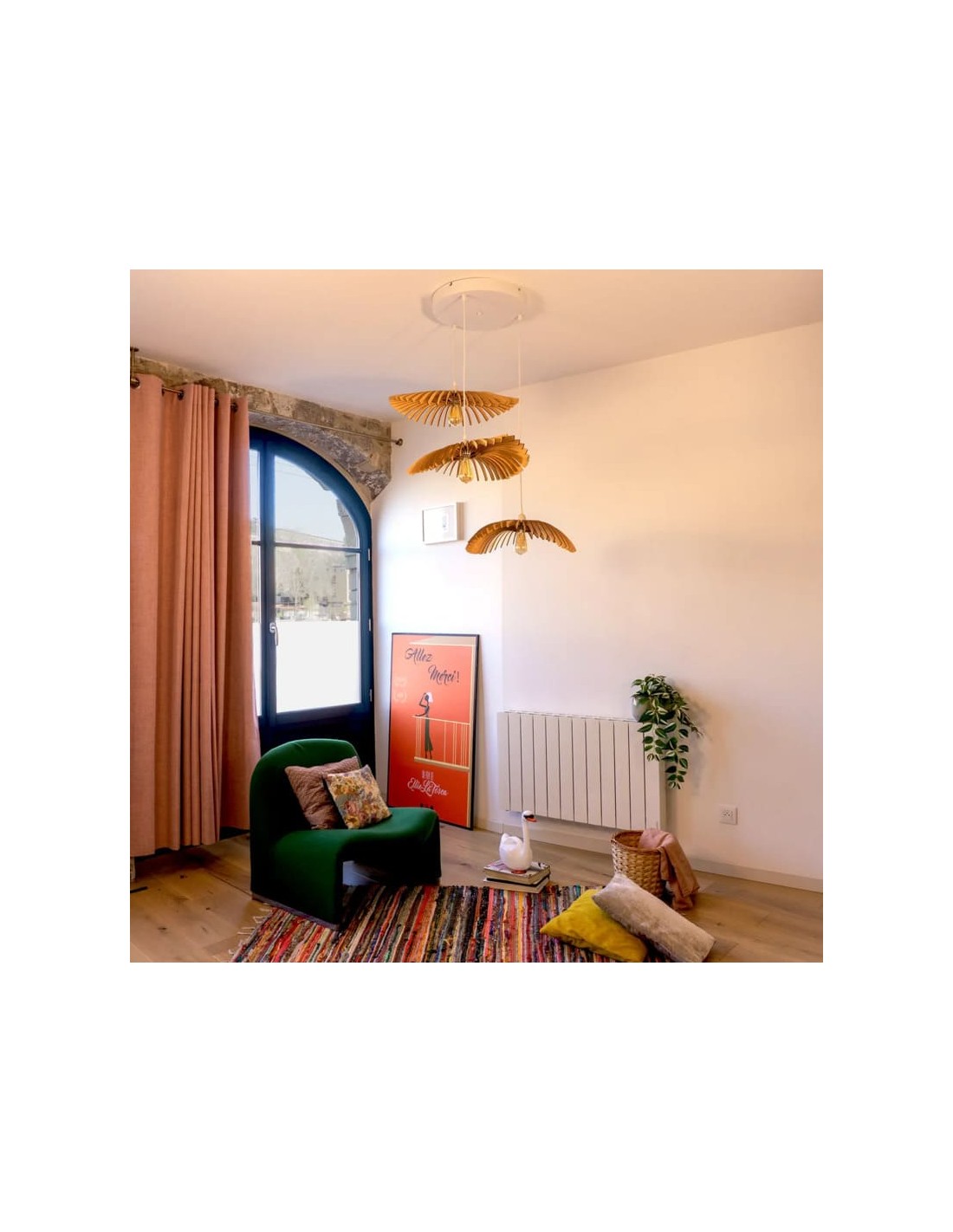 Équipée de trois câble textiles en coton ajustables jusqu'à 2 mètres, cette suspension s'adapte parfaitement aux plafond hauts et aux compositions en cascade.