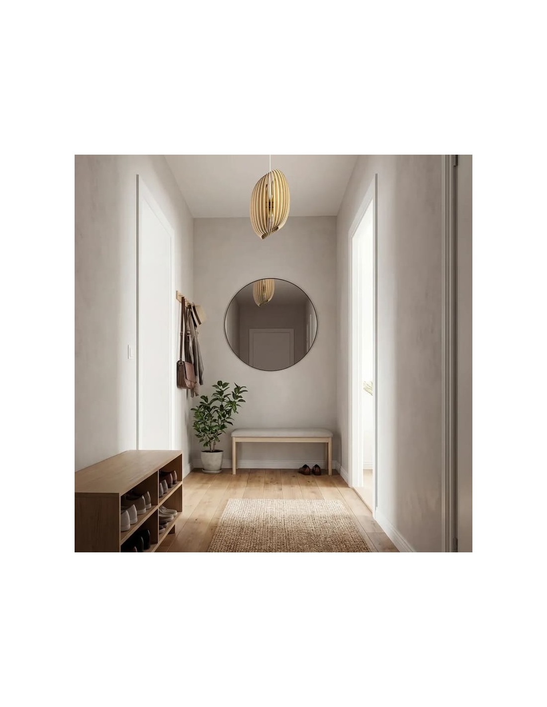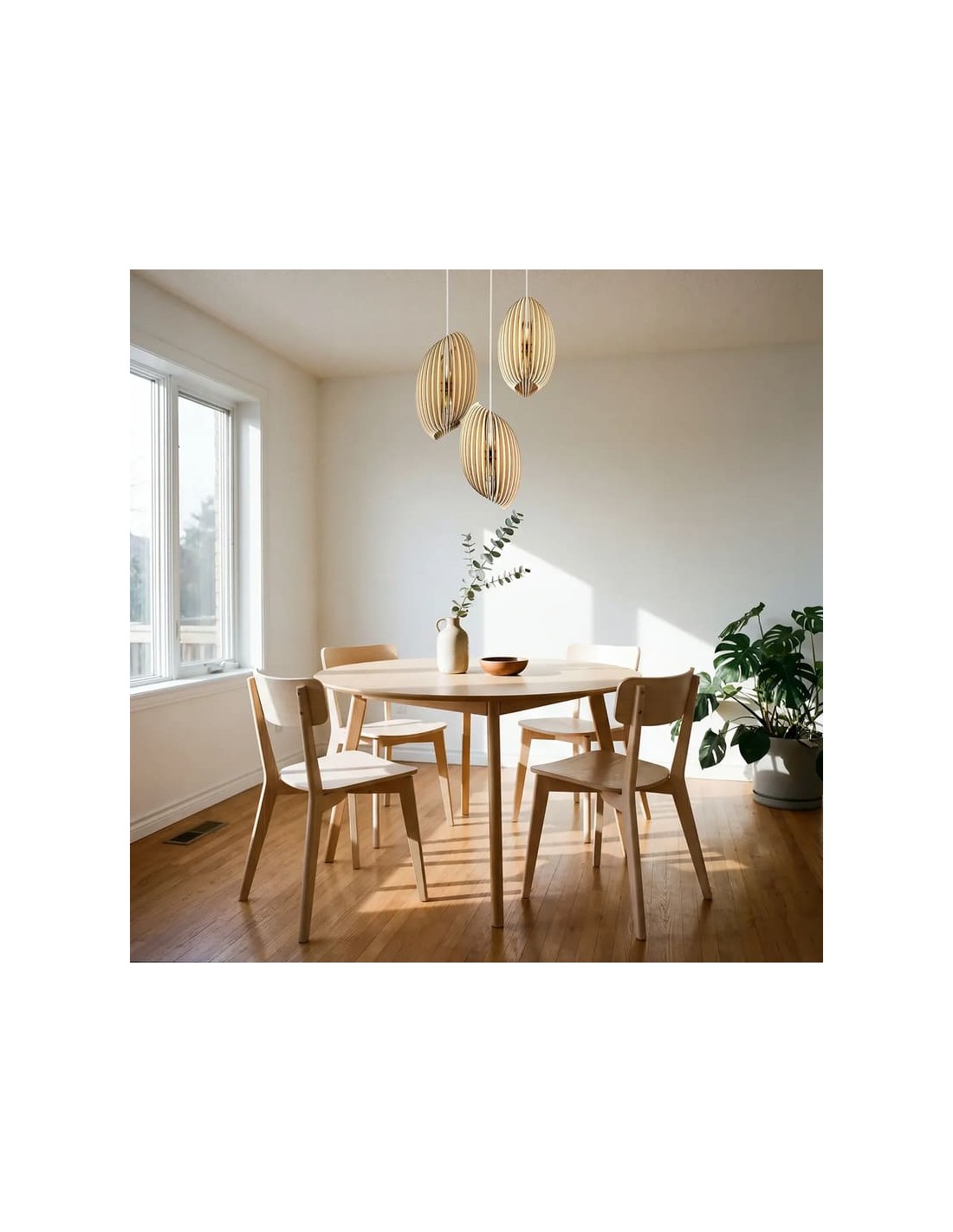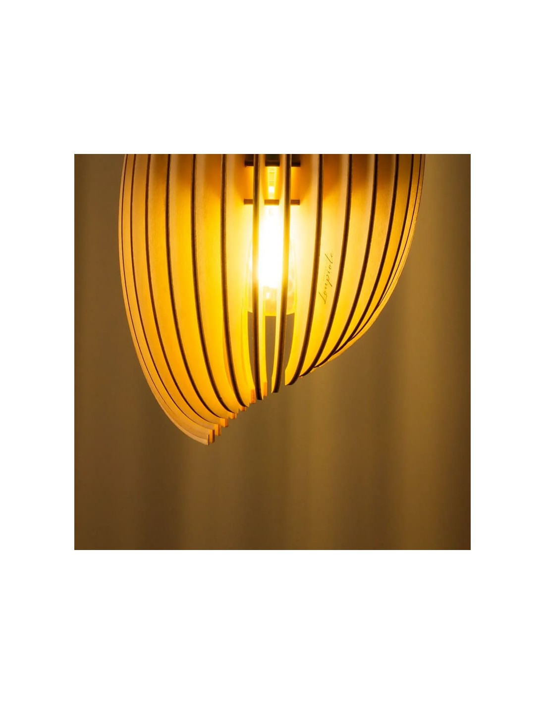 Sa structure en lamelles de bois diffuse une lumière douce et chaleureuse, tout en créant de subtils jeux d'ombres, idéale pour une décoration contemporaine, naturelle ou scandinave.