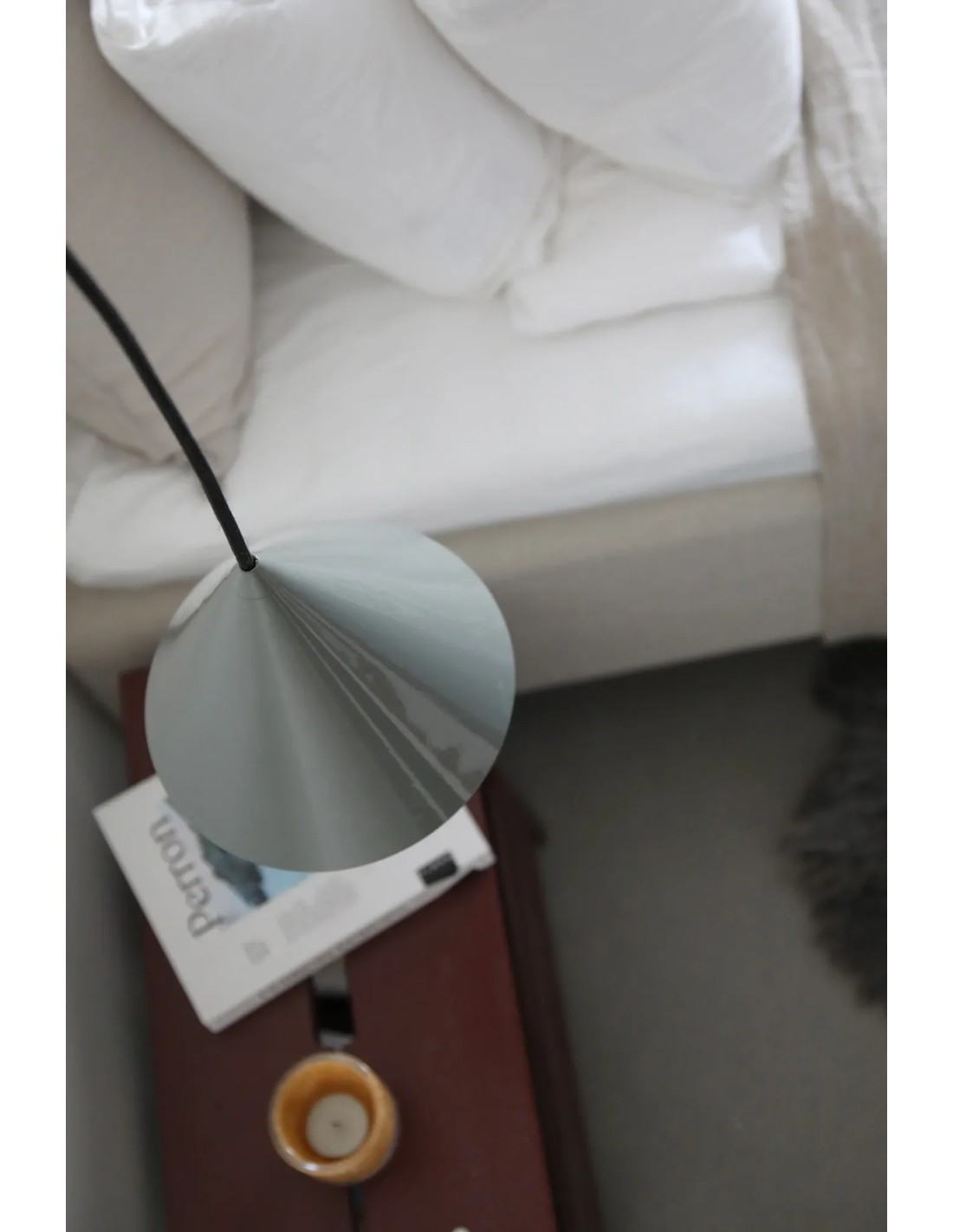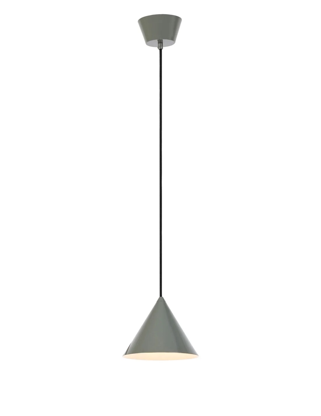 Avec sa forme conique et sa finition gris sobre, ce plafonnier offre un rendu discret et élégant.