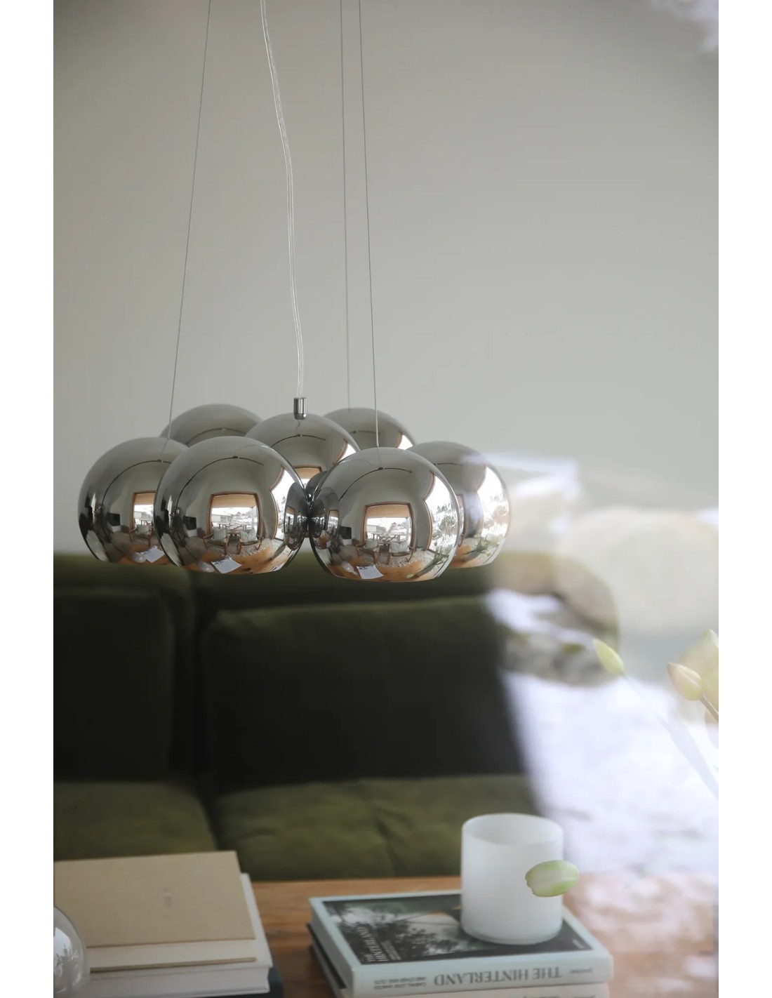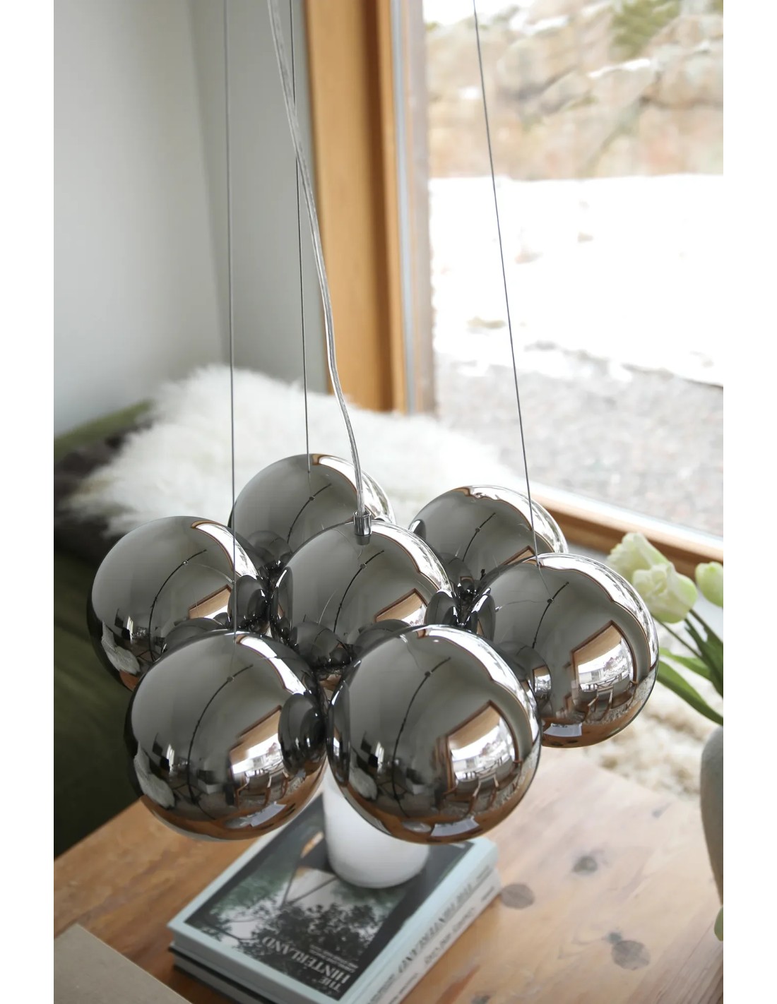 La suspension Cupolo de la marque Markslojd se distingue par sa structure en métal chromé brillant composée de sept globes lumineux disposés en forme légèrement arrondie.