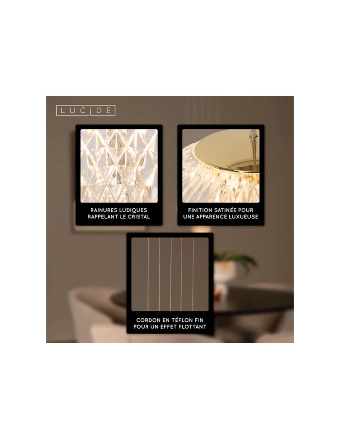 La suspension Cintra de la marque Lucide se distingue par son design élégant en finition or mat et laiton, associé à des diffuseurs en acrylique transparent effet cristal.