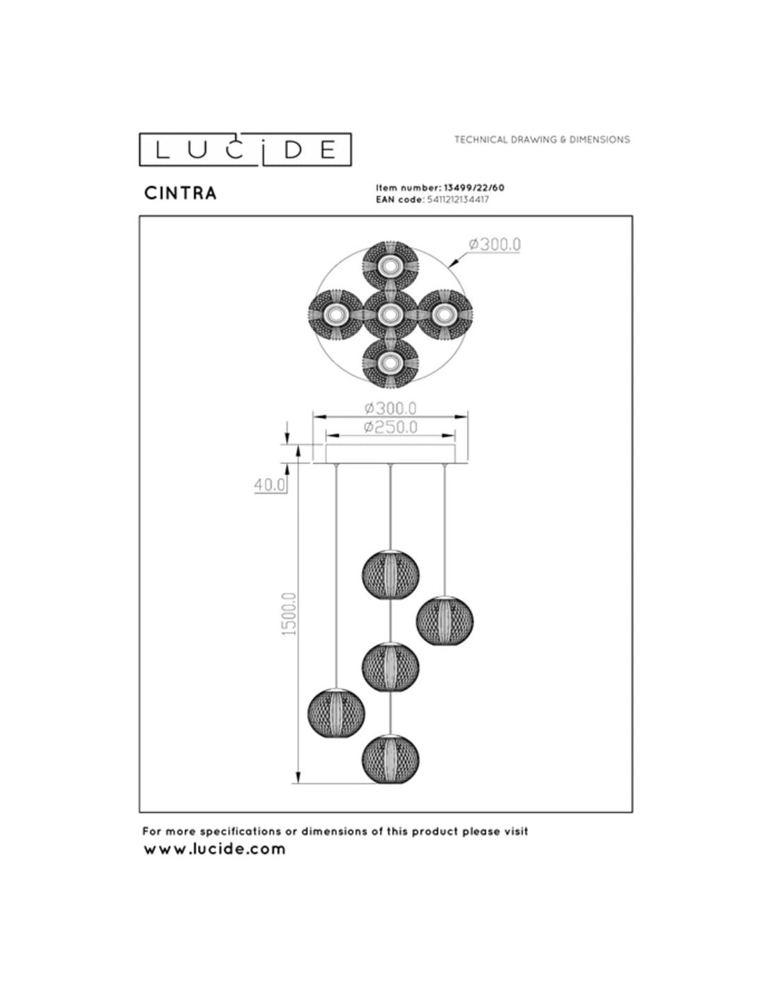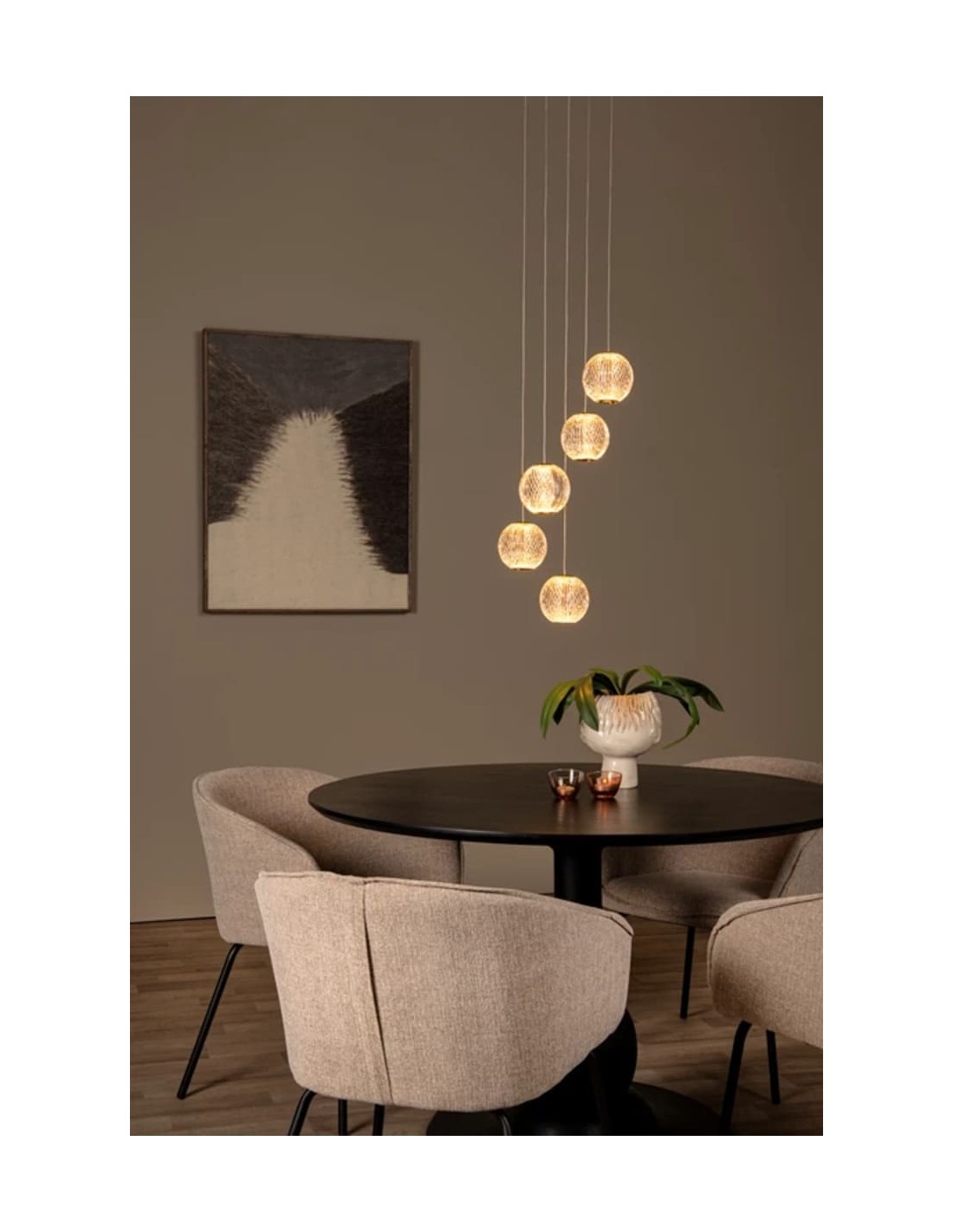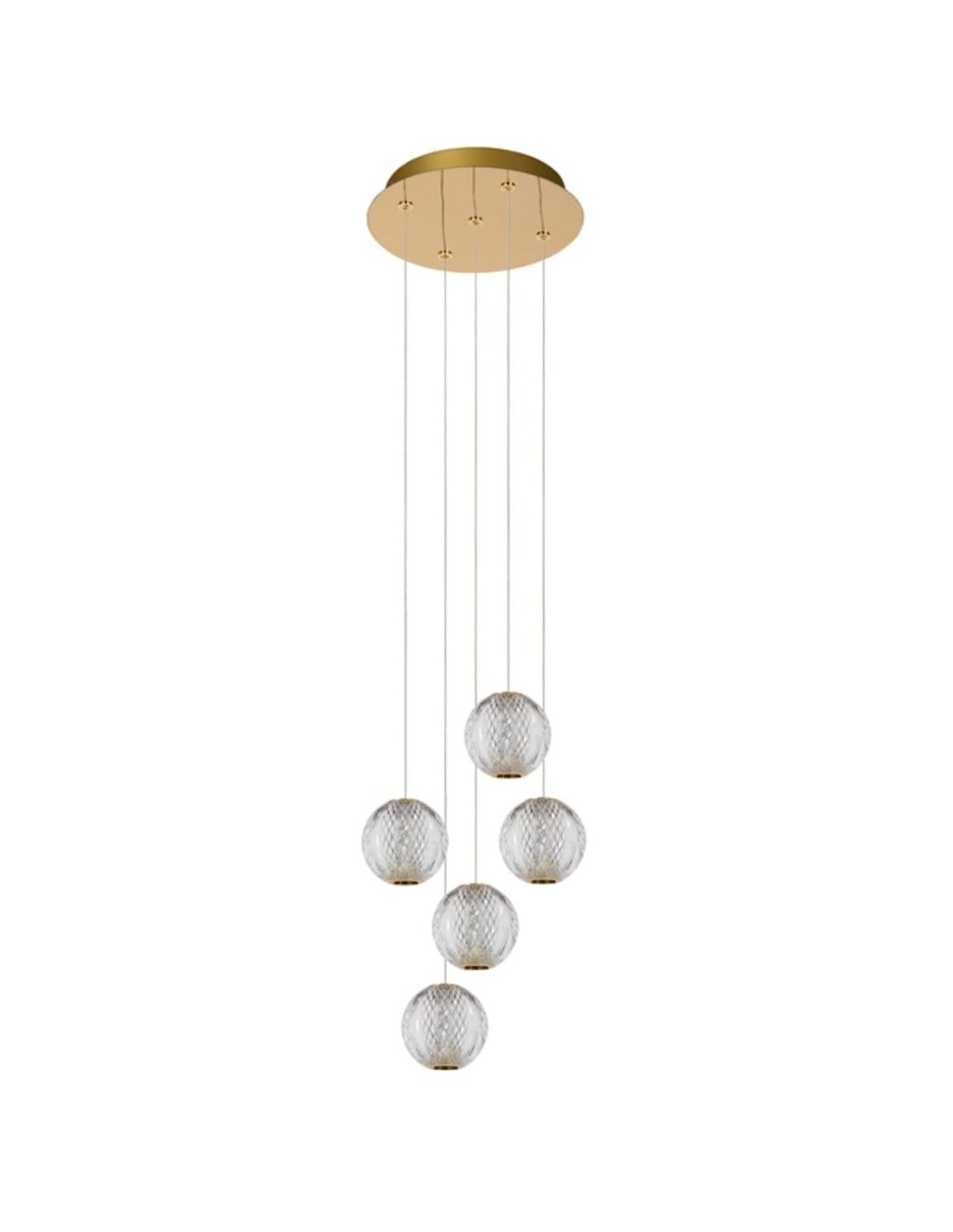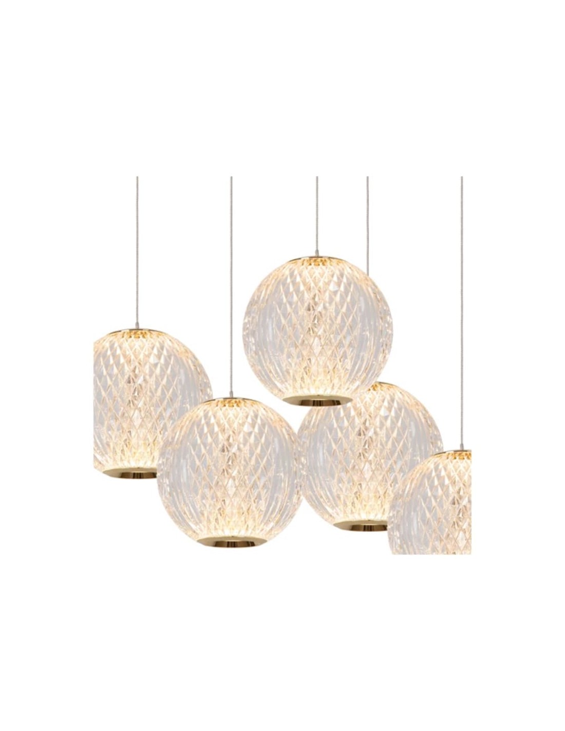 Sur le plan des dimensions, le modèle présente une largeur d'environ 84 cm pour la version à 5 points lumineux (plaque de fixation en laiton), avec des abat-jours sphériques d'environ 11 x11 x 9.8 cm chacun.