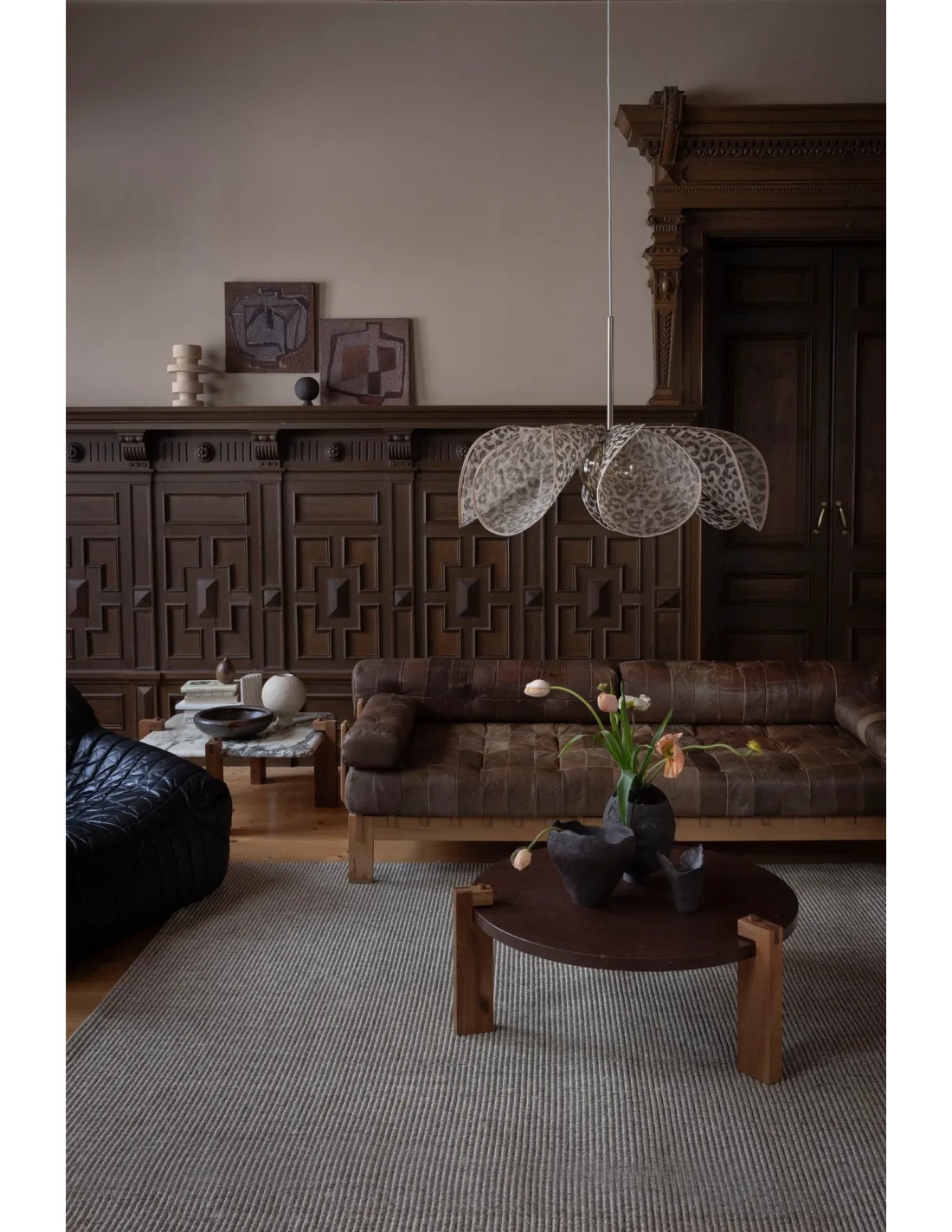 La suspension Markslojd Styrka Leo 75 cm séduit par son design floral imposant et son motif léopard discret en noir et beige. Il est conçu avec une structure en fer, des pétales en fibre de bananier et un diffuseur en verre ambré placé sous la fleur pour une lumière douce et chaleureuse.