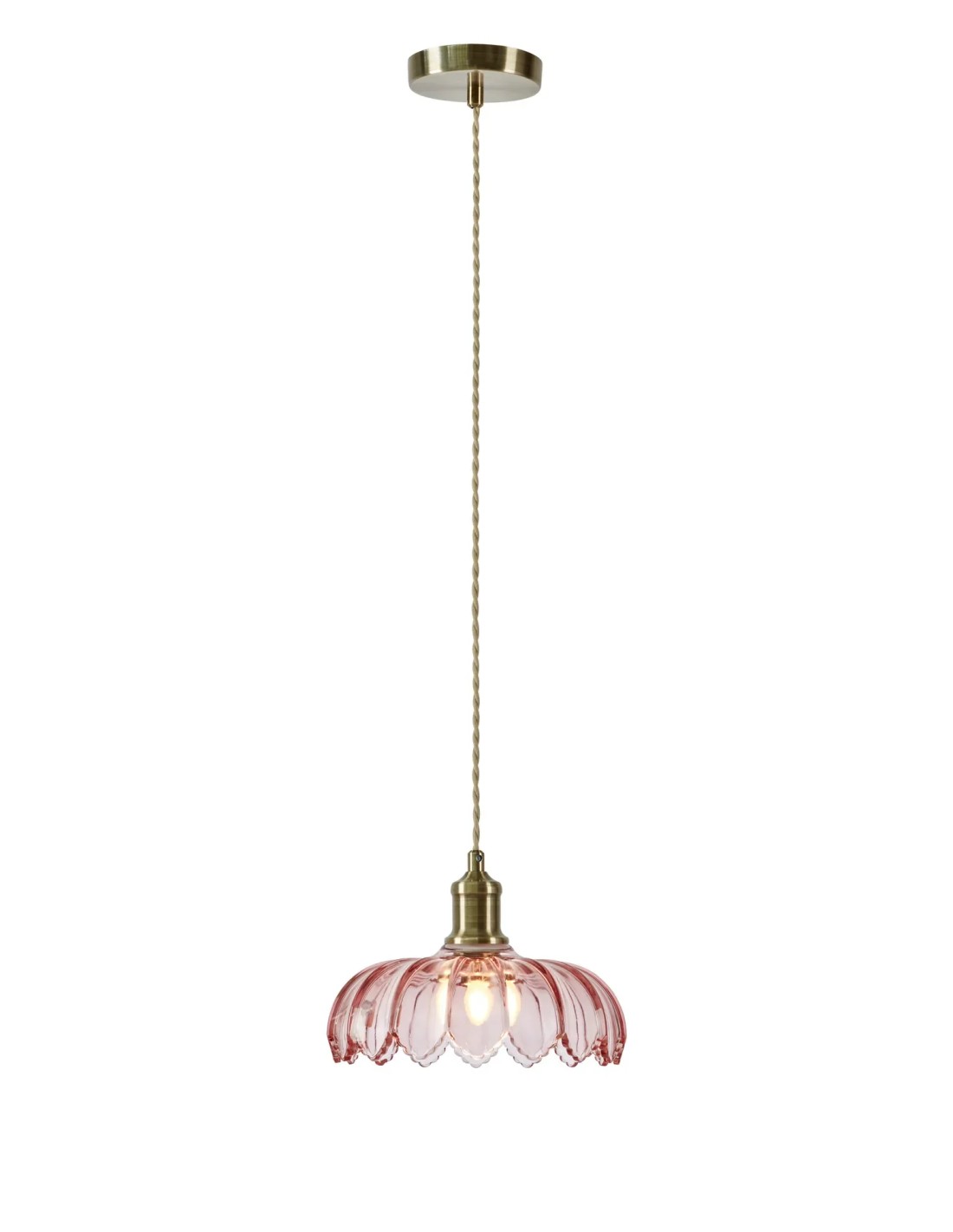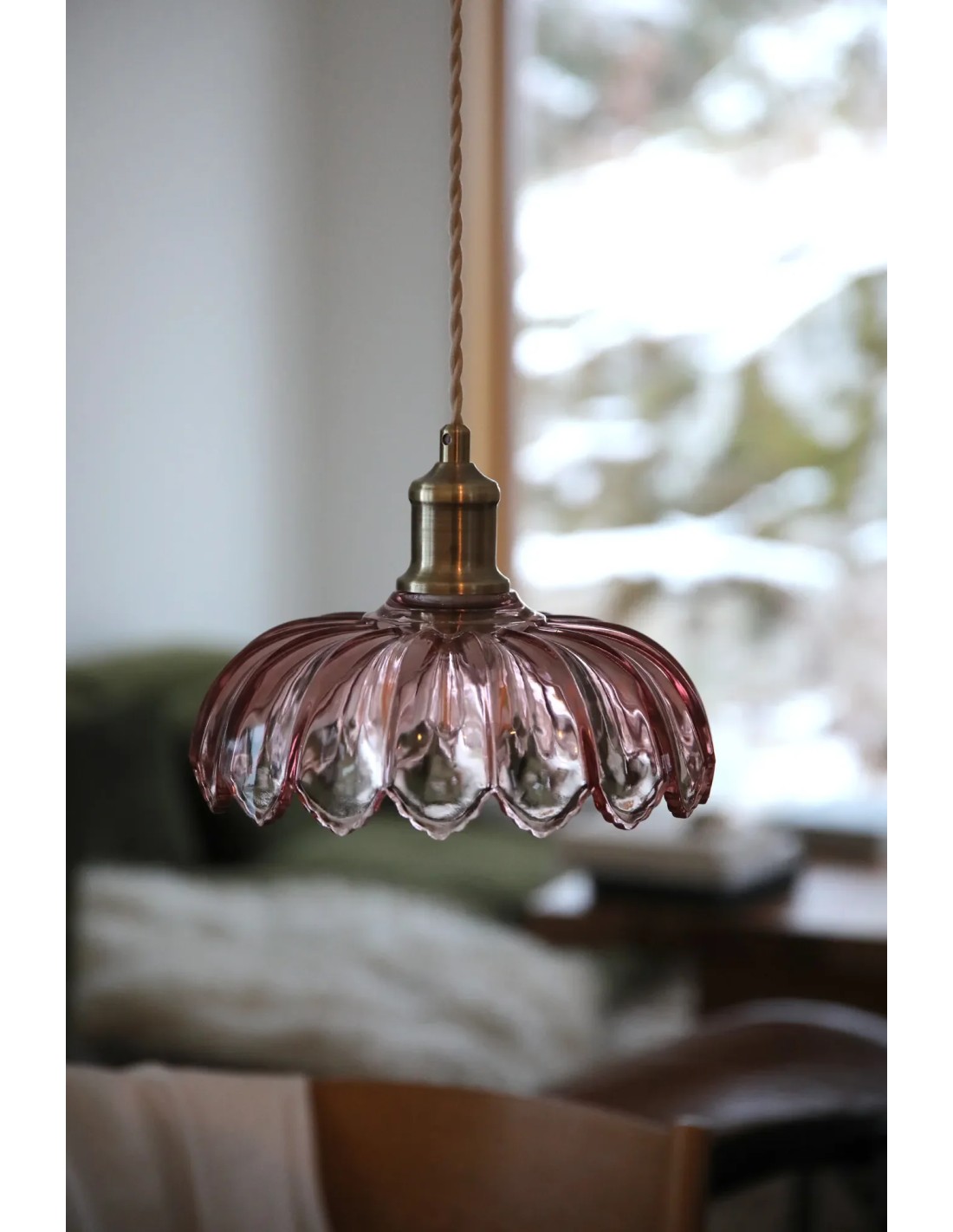 Le verre teinté rose diffuse une lumière douce et chaleureuse, idéale pour créer une ambiance conviviale. L’association du laiton antique et du verre coloré apporte une touche élégante et contemporaine.