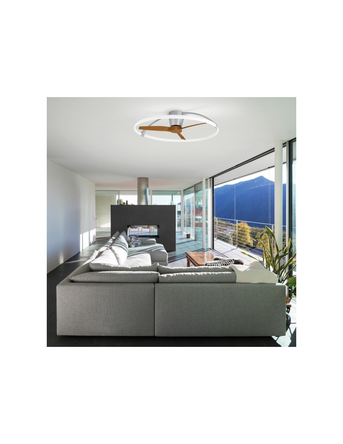 Le plafonnier/ventilateur Led Népal est en métal et plastique de couleur argent/noyer