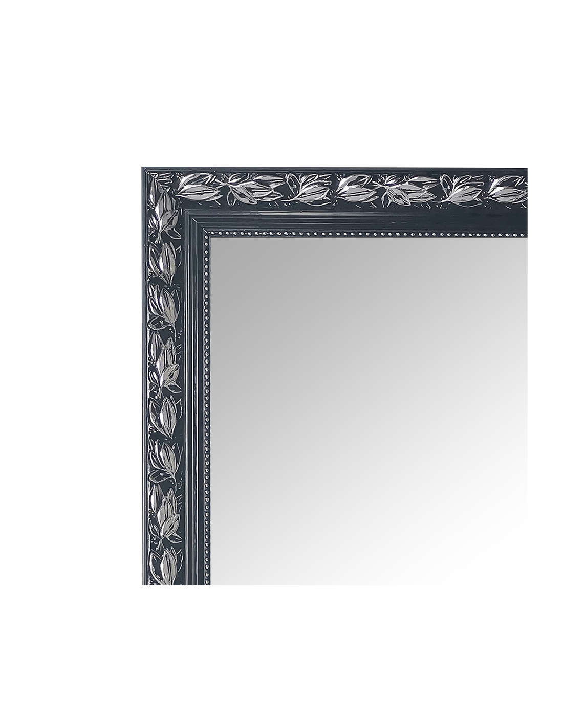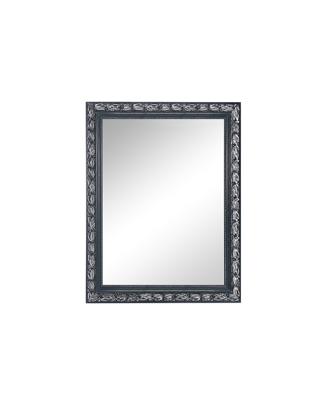 Tanja est un miroir en verre encadré de bois ouvragé et laqué noir surfacé argenté .