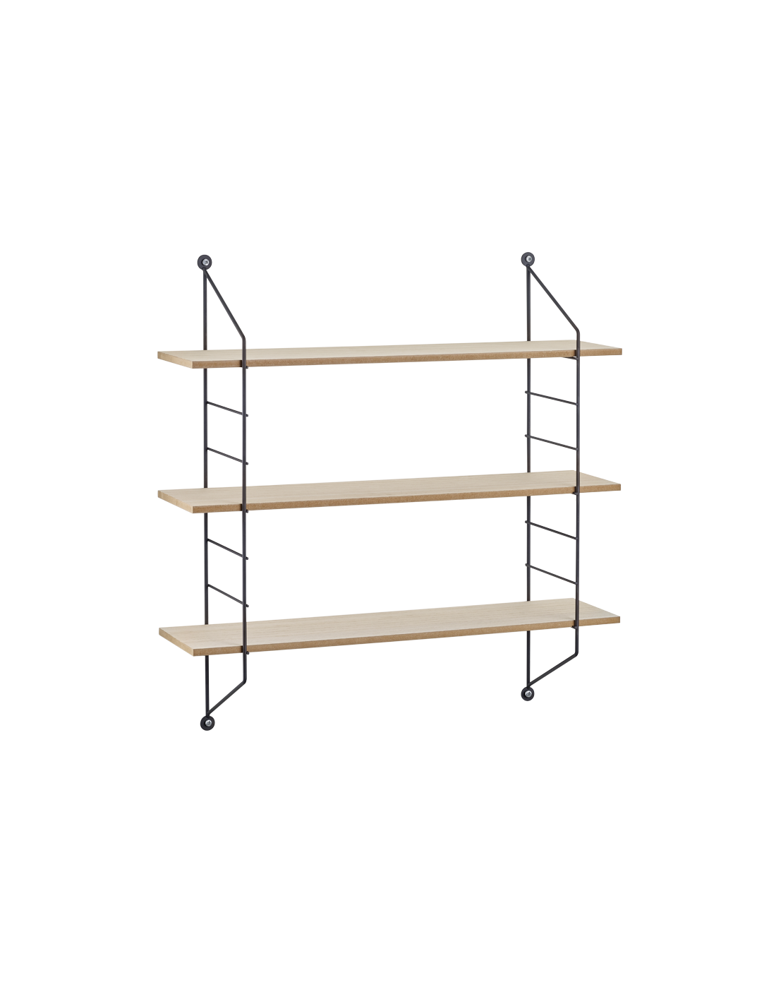 Clara est une étagère en métal laqué noir mat et bois clair.