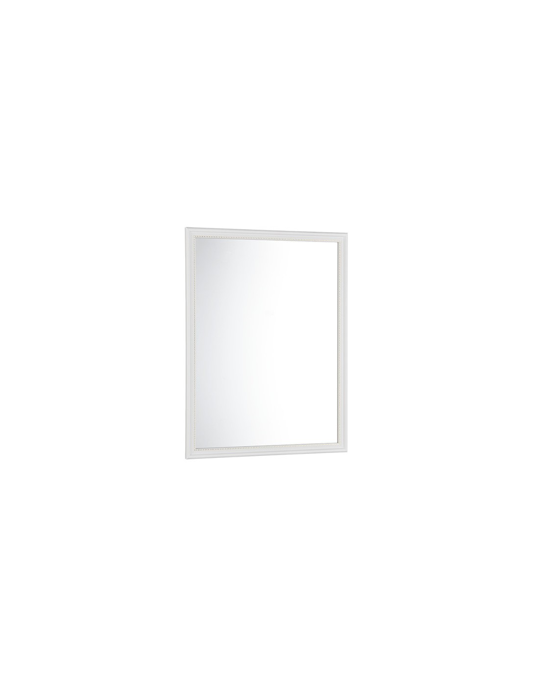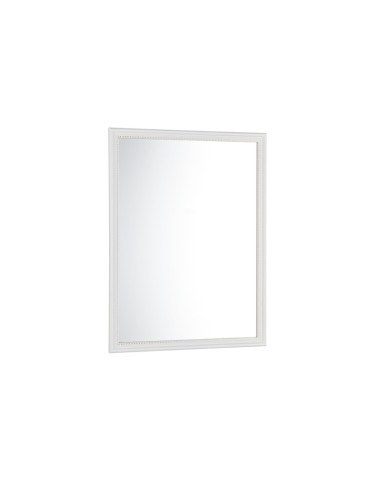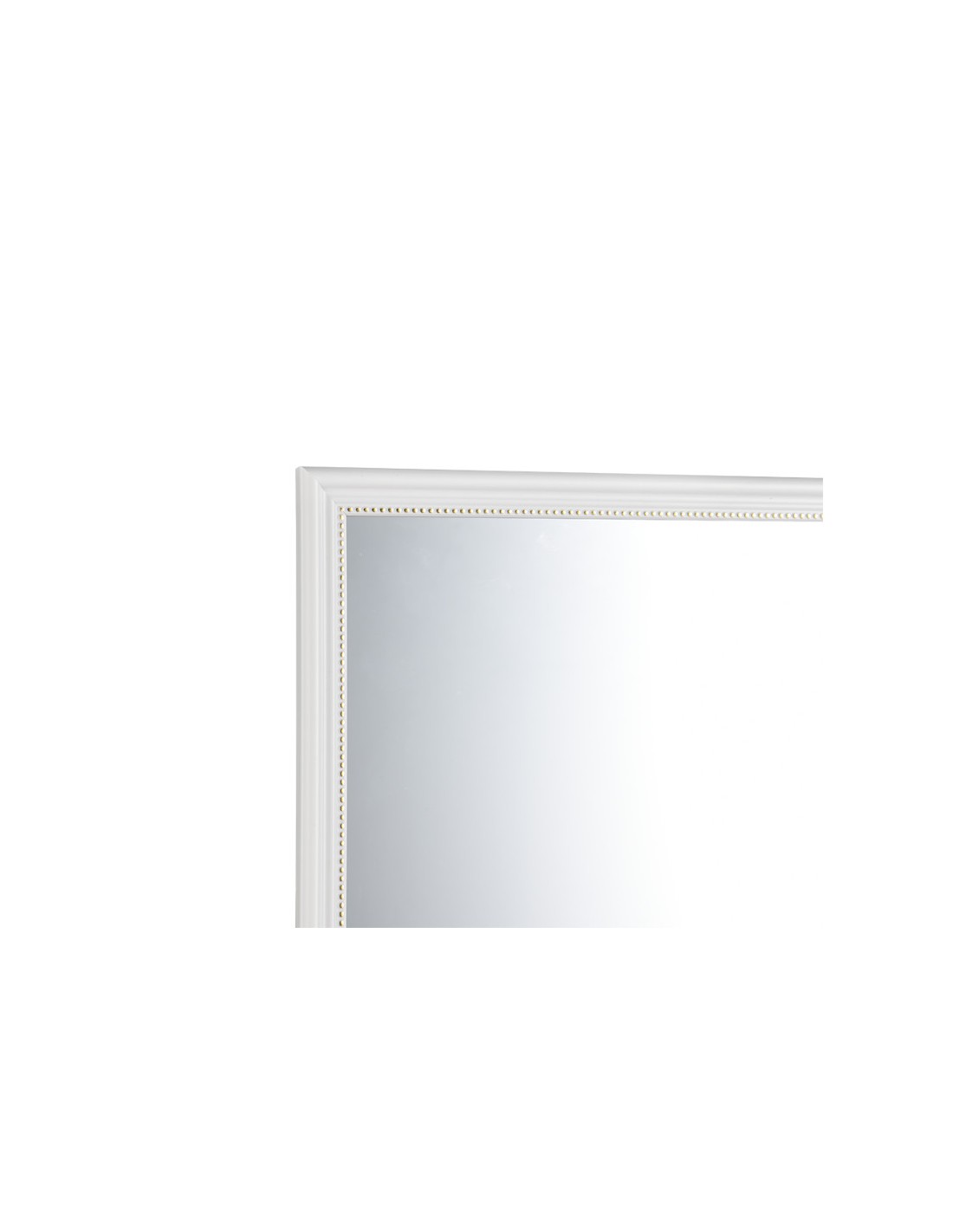Elenor est un miroir en verre encadré de plastique laqué blanc avec une bordure de perles dorées.