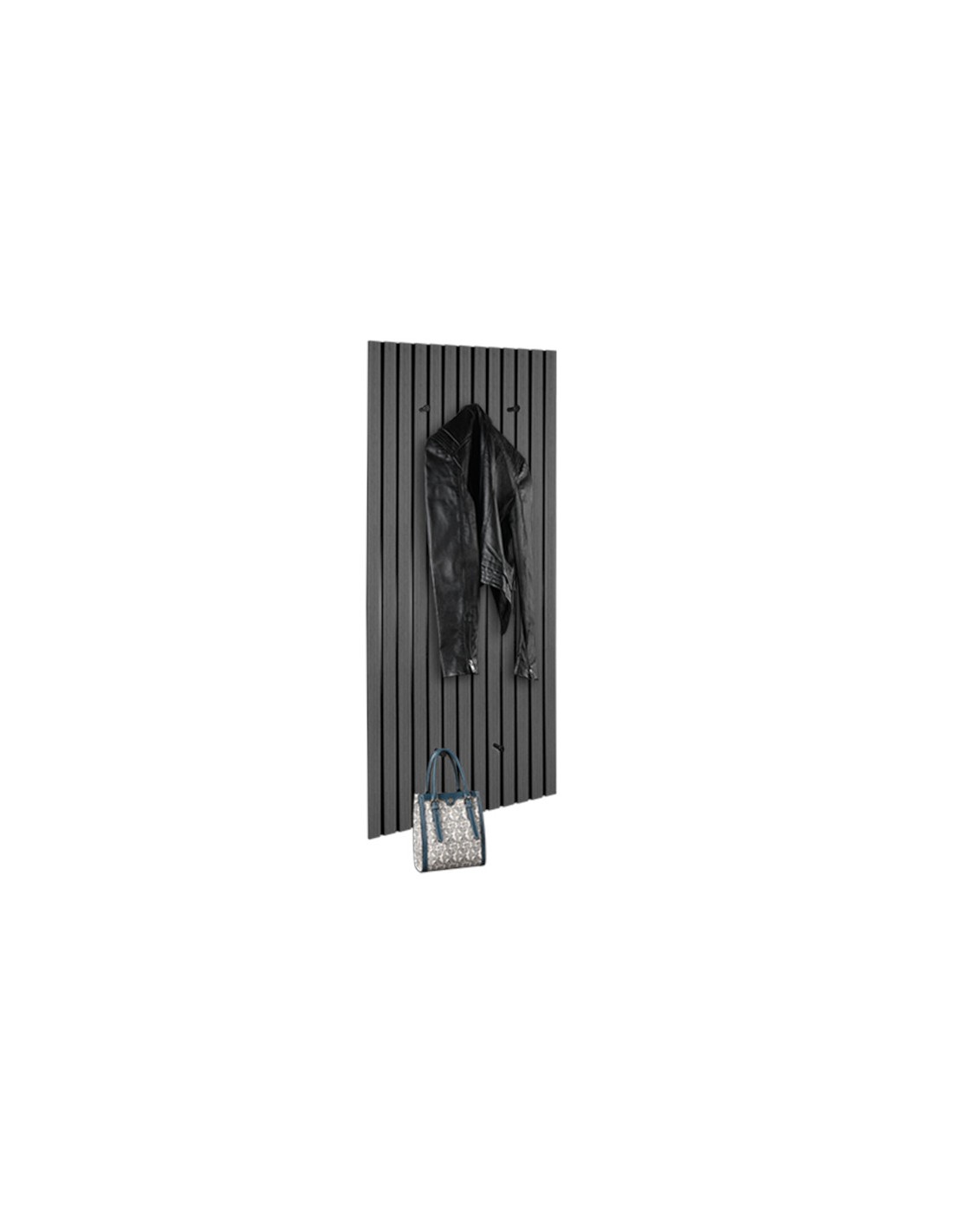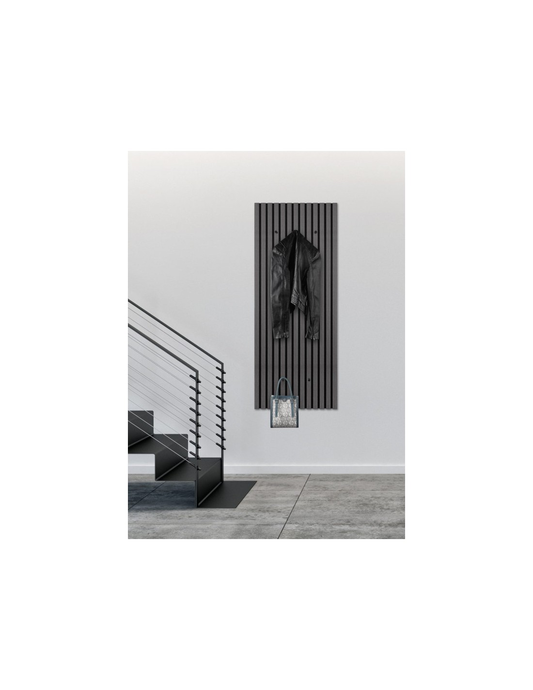 L'armature est en métal noir et le panneau mural est constitué de lames de MDF couleur anthracite. Ce porte-manteau est équipé de 5 crochets de suspension, 3 en haut et 2 en bas pour recevoir vêtements ou accessoires.